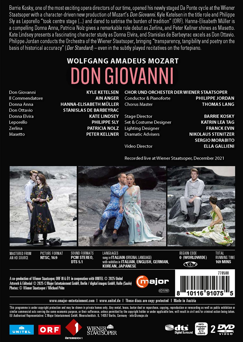 Barrie Kosky, einer der interessantesten Opernregisseure unserer Zeit, eröffnete seinen neu inszenierten Da-Ponte-Zyklus an der Wiener Staatsoper mit einer charakterorientierten Neuproduktion von Wolfgang Amadeus Mozarts „Don Giovanni“. Kyle Ketelsen in der Titelrolle und Philippe Sly als Leporello wurden von der Presse dafür gelobt, dass sie mit einem Augenzwinkern spielen. Hanna-Elisabeth Müller ist eine überzeugende Donna Anna, Patricia Nolz gibt ein bemerkenswertes Rollendebüt als Zerlina und Peter Kellner glänzt als Masetto. Kate Lindsey präsentiert eine faszinierende Charakterstudie als Donna Elvira und Stanislas de Barbeyrac brilliert als Don Ottavio. Philippe Jordan dirigiert das Orchester der Wiener Staatsoper – in einre historisch informierte Aufführung mit subtil gespielten Rezitativen auf dem Hammerklavier. Die Oper wurde im Dezember 2021 in der Wieners Staatsoper aufgezeichnet. Der US-amerikanische Bassbariton Kyle Ketelsen ist sowohl in seiner Heimat als auch in Europa erfolgreich und ist schon in zwei weiteren Video-Aufnahmen dieser Oper zu sehen, dort allerdings als Leporello. Auch sein Kollege Philippe Sly aus Kanada ist Spezialist für Mozart und sang bereits in „Cosi fan tutte“ und „Le nozze di Figaro“. In „Don Giovanni“ trat er beim Aix-en-Provence Festival sogar in der Titelrolle auf. Die deutsche Sopranistin Hanna-Elisabeth Müller ist international unterwegs, auch als Liedsängerin, aber vor allem singt sie in vielen großen europäischen Opernhäusern.
