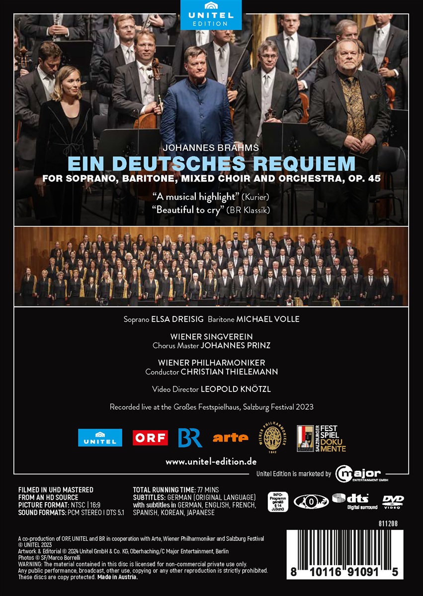 Als Brahms sein „Ein deutsches Requiem“ komponierte, dachte er weniger an das Seelenheil der Verstorbenen, als an die Hinterbliebenen: Mit seiner Musik wollte er Trost spenden. Folgerichtig entschied er sich gegen den üblichen, abstrakten lateinischen Text und wählte stattdessen deutsche Texte aus der Lutherbibel aus. In dieser Aufführung aus dem großen Festspielhaus in Salzburg vom August 2023 beschwören Christian Thielemann, die Wiener Philharmoniker, der Wiener Singverein und zwei brillante Solisten – die Sopranistin Elsa Dreisig und der Bariton Michael Volle – genau diese zutiefst menschliche Regung des Trostes herauf. Thielemanns Dirigat wurde für ihr ‚harmonisches Gleichgewicht zwischen Intimität und archaischen Momenten‘ von der Presse begeistert aufgenommen.