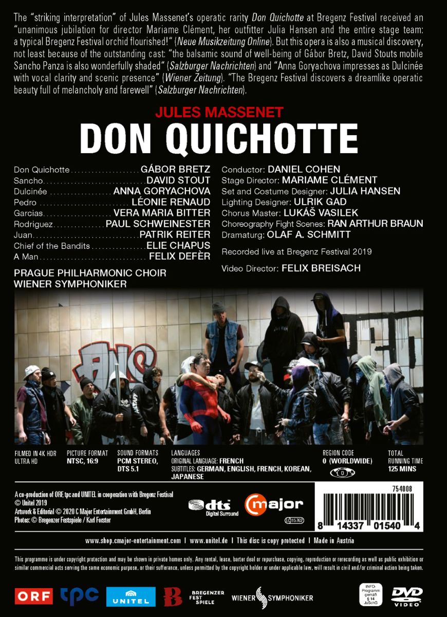 Aber nicht nur die Inszenierung weiß zu überzeugen: Auch musikalisch ist die Oper eine echte Entdeckung, nicht zuletzt ob der herausragenden Gesangsriege: Der „warme, fließende Bassbariton“ (Salzburger Nachrichten) von Gábor Bretz als Don Quichotte, David Stout als Sancho Panza, der „mit seinem Bariton die Buffopartie mit großem Spielwitz meistert“ (Salzburger Nachrichten) und Anna Goryachova, die als Dulcinée „mit vokaler Klarheit und szenischer Präsenz“ (Wiener Zeitung) überzeugt, erweisen sich als passgenaue Besetzung. Last but not least konnten „die Wiener Symphoniker unter Daniel Cohen (…) in der guten Akustik des Festspielhauses ihre Qualitäten unter Beweis stellen.“