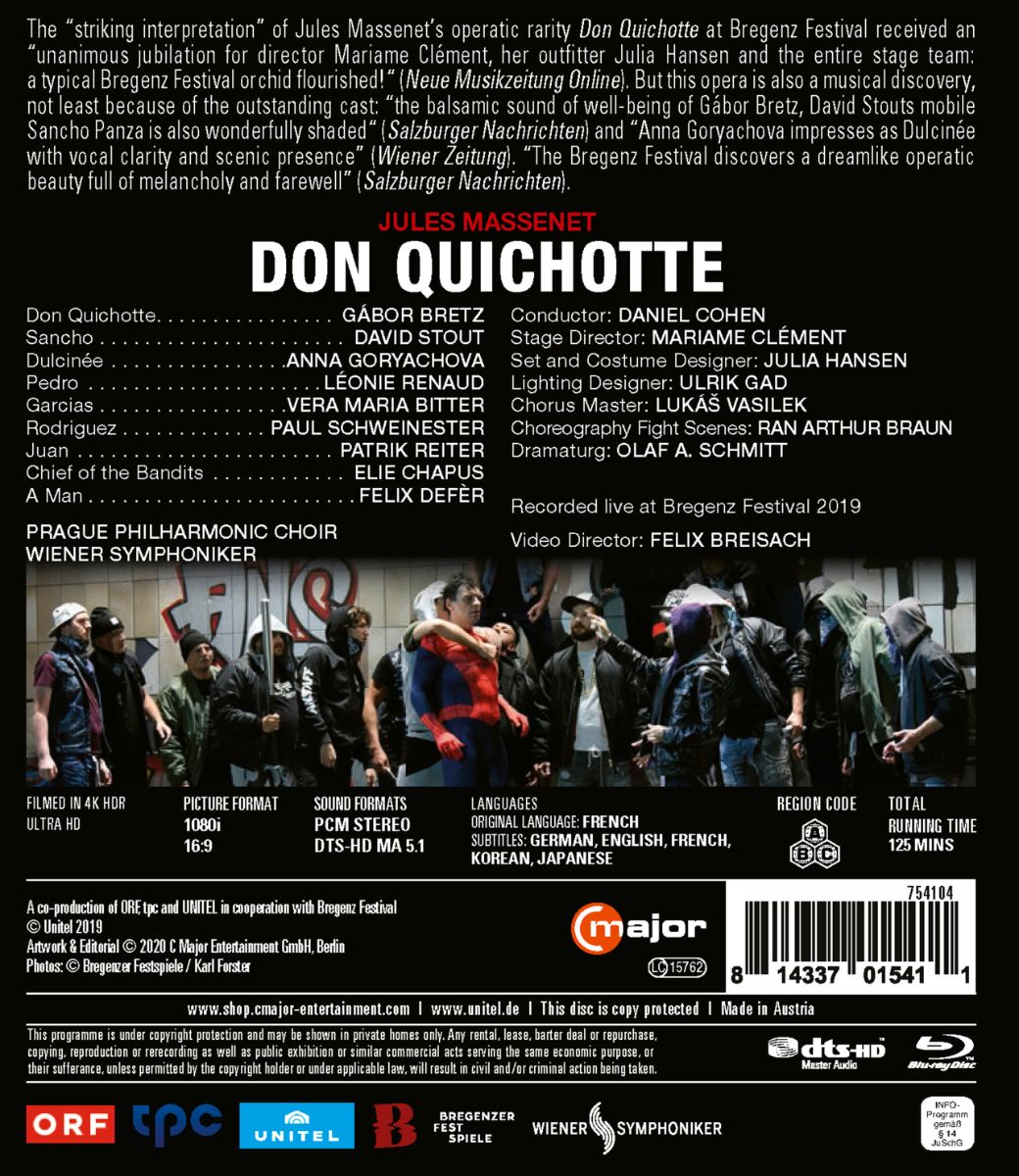 Aber nicht nur die Inszenierung weiß zu überzeugen: Auch musikalisch ist die Oper eine echte Entdeckung, nicht zuletzt ob der herausragenden Gesangsriege: Der „warme, fließende Bassbariton“ (Salzburger Nachrichten) von Gábor Bretz als Don Quichotte, David Stout als Sancho Panza, der „mit seinem Bariton die Buffopartie mit großem Spielwitz meistert“ (Salzburger Nachrichten) und Anna Goryachova, die als Dulcinée „mit vokaler Klarheit und szenischer Präsenz“ (Wiener Zeitung) überzeugt, erweisen sich als passgenaue Besetzung. Last but not least konnten „die Wiener Symphoniker unter Daniel Cohen (…) in der guten Akustik des Festspielhauses ihre Qualitäten unter Beweis stellen.“