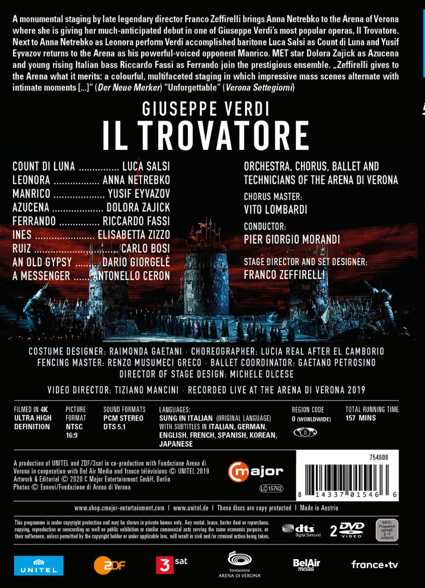 Eines der beliebtesten Meisterwerke des Opernrepertoires stand 2019 auf dem Programm der Festspiele in Verona: Verdis „Il Trovatore“. Die Produktion sollte die letzte Inszenierung des kurz vor der Premiere verstorbenen italienischen Regisseurs Franco Zeffirelli werden. Sie erscheint nun, technisch brillant eingefangen, als DVD und Blu-ray. Zeffirelli bringt das Spiel um Liebe, Hass, Eifersucht und Tod mit stimmungsvollen, gewaltigen Bildern und Menschenmassen auf die Riesenbühne der Arena di Verona. Mit wunderschönen Kostümen und Requisiten gelingt Ihm eine klassische aber trotzdem zeitgemäße Interpretation, die jeden Opernliebhaber optisch und auch akustisch erfreuen wird.