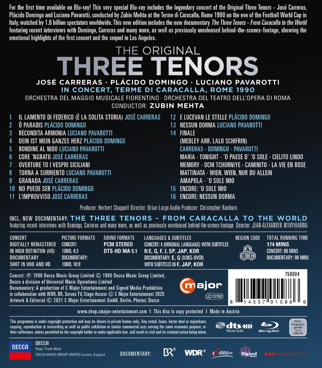 Es gibt nicht so viele Momente in der Geschichte der klassischen Musik, die als echtes Massenphänomen die Popkultur beeinflusst haben: Das berühmte erste Konzert der drei Tenöre José Carreras, Plácido Domingo und Luciano Pavarotti vom 7. Juli 1990 in Rom ist gewiss so eine seltene Ausnahme. Nun erscheint das Konzert erstmalig digitally remastered in bester Bild und Tonqualität auf Blu-ray.