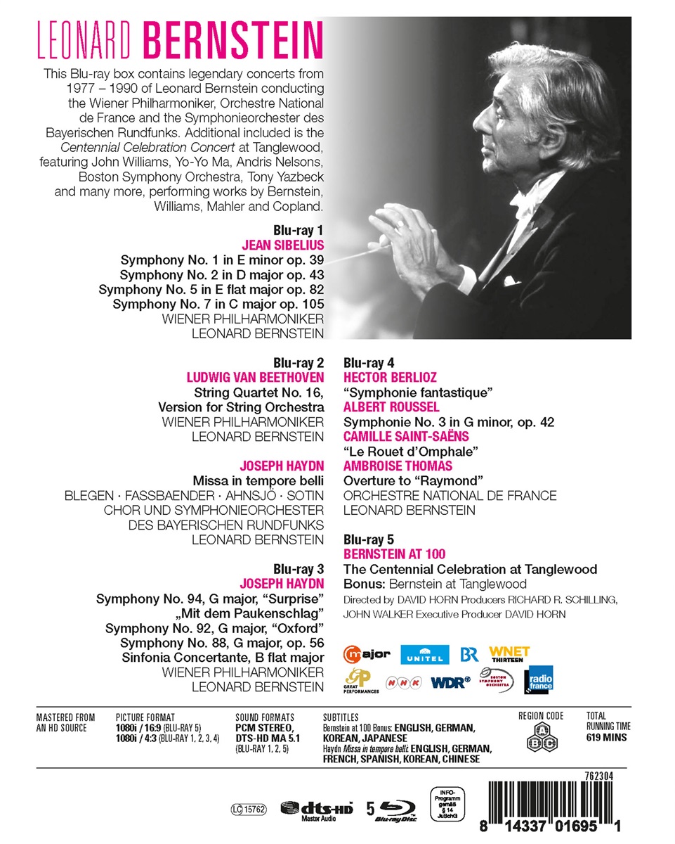Diese Blu-ray-Box enthält legendäre Konzerte aus den Jahren 1977–1990 von Leonard Bernstein mit den Wiener Philharmonikern, dem Orchestre National de France und dem Symphonieorchester des Bayerischen Rundfunks. Zu hören ist quasi Bernsteinsches Kernrepertoire: Sinfonien von Sibelius, Haydn, Berlioz, Roussel und die berühmte Bearbeitung für Streichorchester des Streichquartett Nr. 16, op. 135 von Ludwig van Beethoven. Zusätzlich enthalten ist das „Centennial Celebration Concert“ in Tanglewood mit John Williams, Yo-Yo Ma, Andris Nelsons, dem Boston Symphony Orchestra und vielen anderen, die Werke von Bernstein, Williams, Mahler und Copland aufführen.