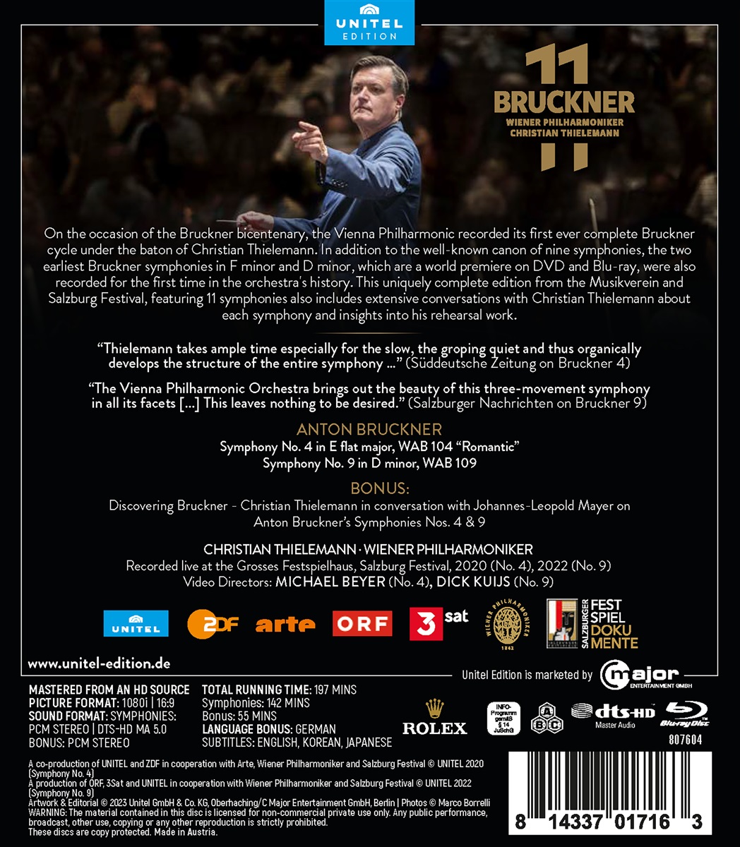 Anlässlich des 200. Jahrestages des Geburtstags von Anton Bruckner haben die Wiener Philharmoniker zum ersten Mal sämtliche Sinfonien des Komponisten aufgenommen. Als Dirigenten hierfür wählten sie den Bruckner-Experten Christian Thielemann. Diese besondere Edition widmet sich allen elf erhaltenen Sinfonien Bruckners, sie umfasst also auch die frühen Sinfonien in f-Moll („Studiensinfonie“) und d-Moll („Nullte“). Mit den Aufnahmen der (vielleicht) populärsten Sinfonien Bruckners, der Nr. 4 in Es-Dur („Die Romantische“) und Nr. 9 in d-Moll schließt die faszinierenden Video-Edition der auf DVD und Blu-ray.