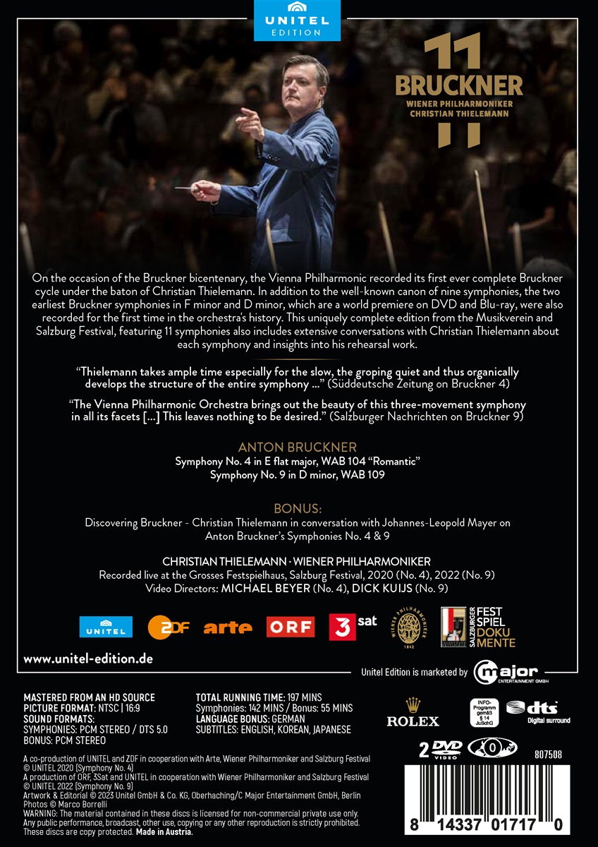 Anlässlich des 200. Jahrestages des Geburtstags von Anton Bruckner haben die Wiener Philharmoniker zum ersten Mal sämtliche Sinfonien des Komponisten aufgenommen. Als Dirigenten hierfür wählten sie den Bruckner-Experten Christian Thielemann. Diese besondere Edition widmet sich allen elf erhaltenen Sinfonien Bruckners, sie umfasst also auch die frühen Sinfonien in f-Moll („Studiensinfonie“) und d-Moll („Nullte“). Mit den Aufnahmen der (vielleicht) populärsten Sinfonien Bruckners, der Nr. 4 in Es-Dur („Die Romantische“) und Nr. 9 in d-Moll schließt die faszinierenden Video-Edition der auf DVD und Blu-ray.