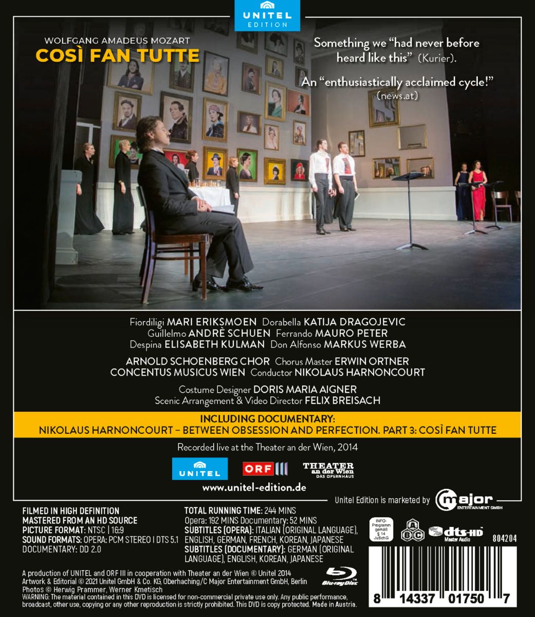 Nikolaus Harnoncourts heute schon legendären Da-Ponte-Zyklus vom Theater an der Wien wurde in lediglich sechs Wochen m Frühjahr 2014 realisiert. Mit seinem Originalinstrumente-Ensemble Concentus Musicus Wien und einer Riege handverlesener Sängerinnen und Sänger wollte er zum einen die Spontaneität einer Opernproduktion in Mozarts Zeiten reproduzieren, zum anderen legte er besonderes Augenmerk auf die Rezitative.