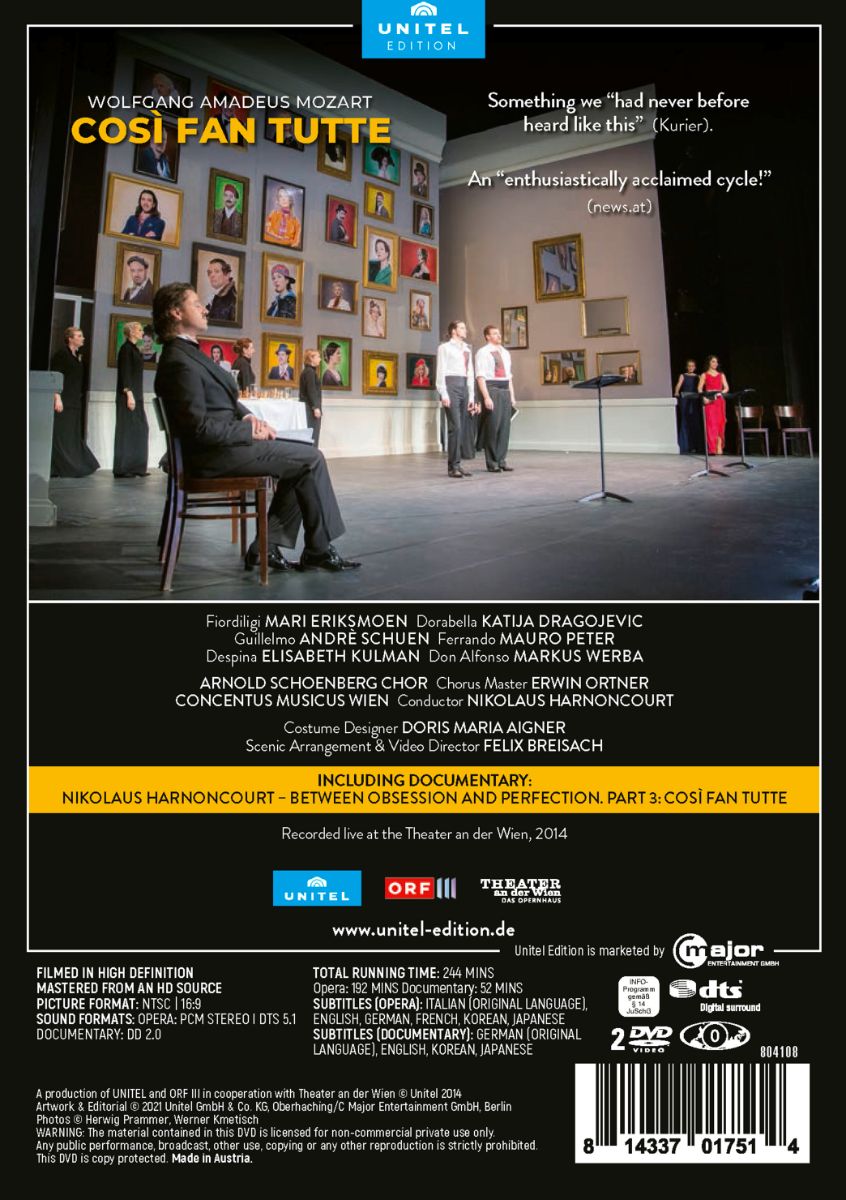 Nikolaus Harnoncourts heute schon legendären Da-Ponte-Zyklus vom Theater an der Wien wurde in lediglich sechs Wochen m Frühjahr 2014 realisiert. Mit seinem Originalinstrumente-Ensemble Concentus Musicus Wien und einer Riege handverlesener Sängerinnen und Sänger wollte er zum einen die Spontaneität einer Opernproduktion in Mozarts Zeiten reproduzieren, zum anderen legte er besonderes Augenmerk auf die Rezitative.