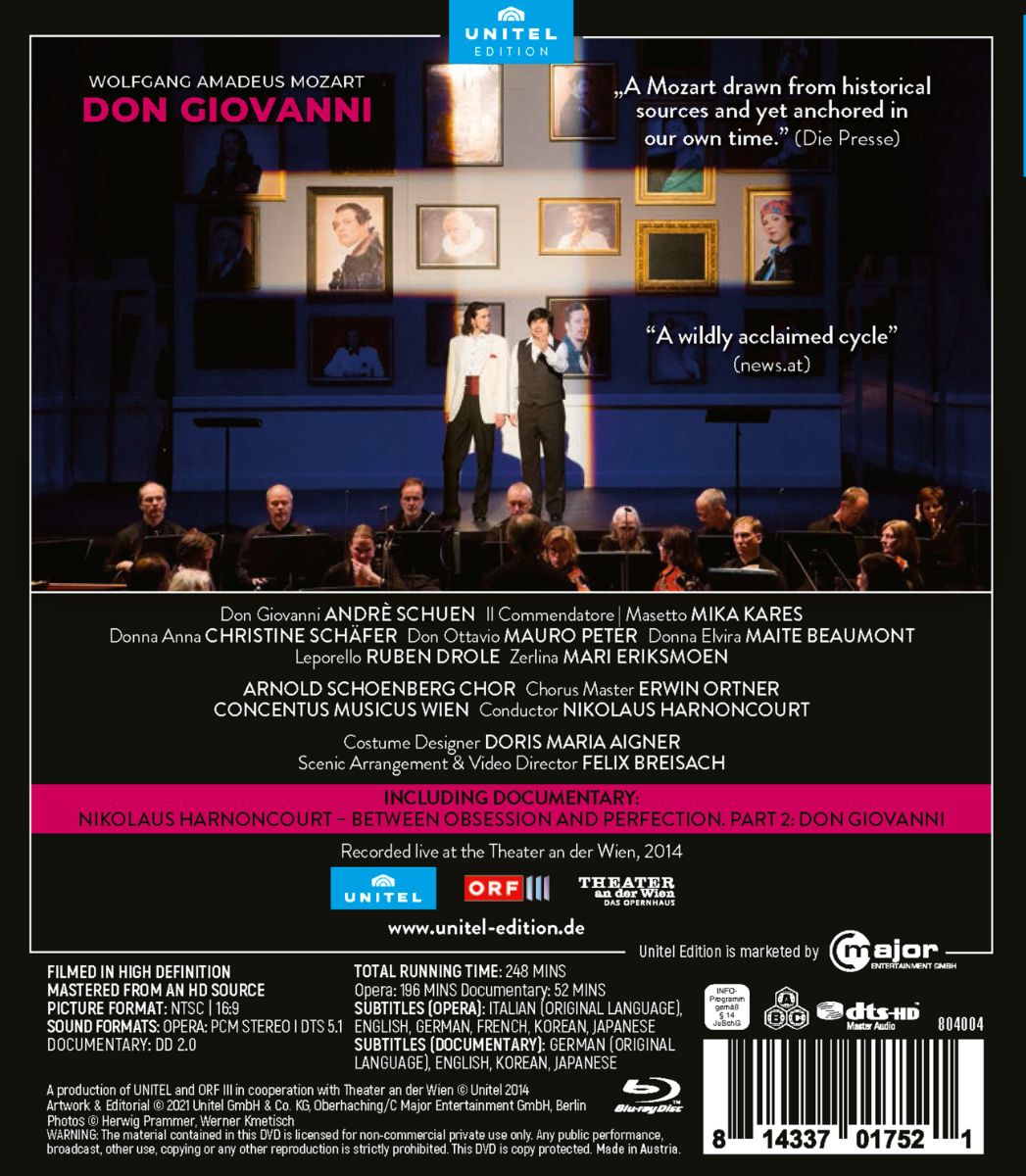 Nikolaus Harnoncourts heute schon legendären Da-Ponte-Zyklus vom Theater an der Wien realisierte der stets unkonventionelle Maestro im Frühjahr 2014 mit seinem Originalinstrumente-Ensemble Concentus Musicus Wien und seinen Lieblingssängerinnen und Sänger, die er spezifisch für die Rollen auswählte. Binnen sechs Wochen brachte er alle drei Opern auf die Bühne. Im Zentrum des Opern-Tryptychons steht der „Don Giovanni“, der „drastisch in nachtschwarz rauer, aufgewühlter und aufwühlender Größe“ (Die Presse) erklingt.