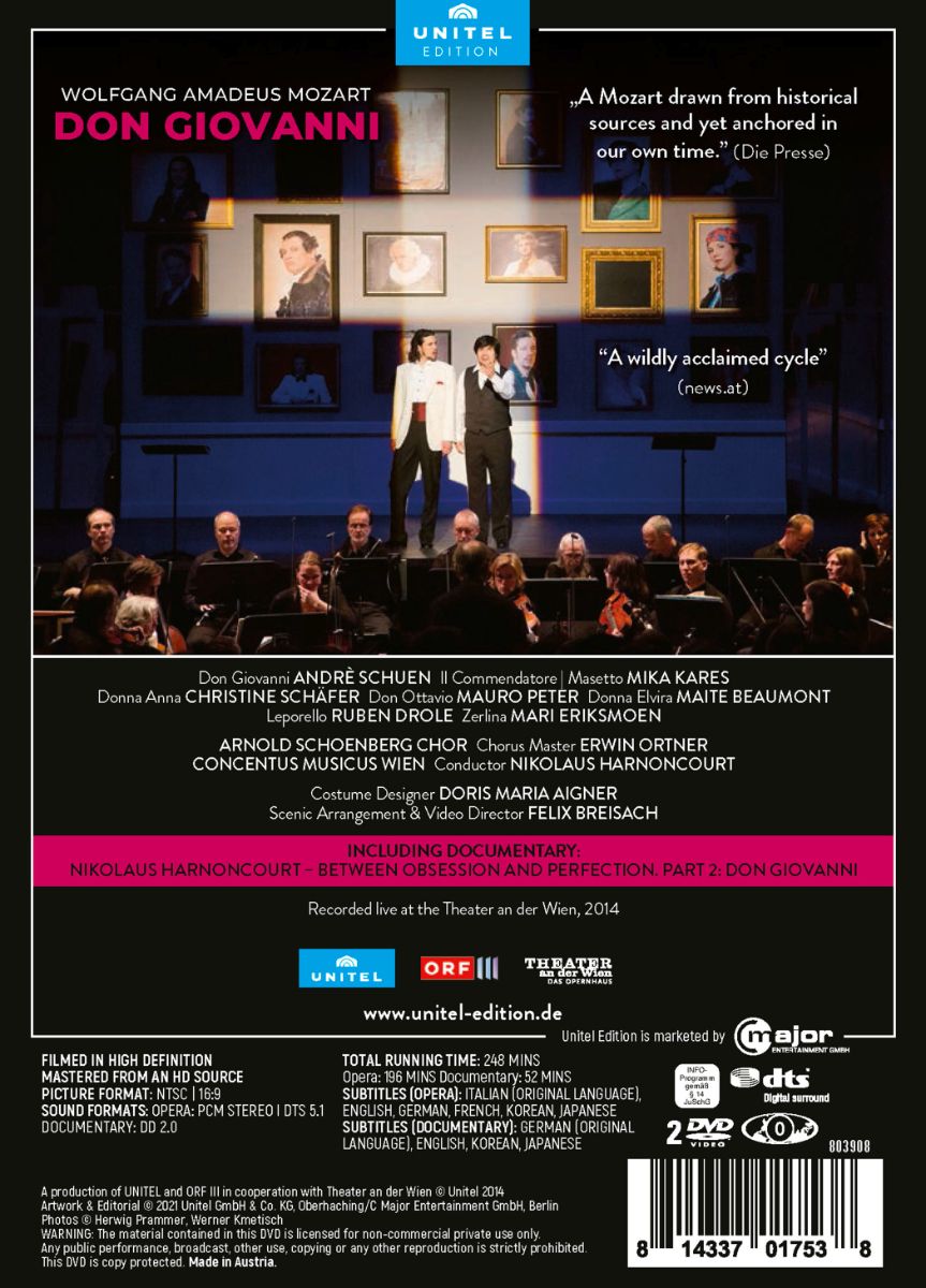 Nikolaus Harnoncourts heute schon legendären Da-Ponte-Zyklus vom Theater an der Wien realisierte der stets unkonventionelle Maestro im Frühjahr 2014 mit seinem Originalinstrumente-Ensemble Concentus Musicus Wien und seinen Lieblingssängerinnen und Sänger, die er spezifisch für die Rollen auswählte. Binnen sechs Wochen brachte er alle drei Opern auf die Bühne. Im Zentrum des Opern-Tryptychons steht der „Don Giovanni“, der „drastisch in nachtschwarz rauer, aufgewühlter und aufwühlender Größe“ (Die Presse) erklingt.