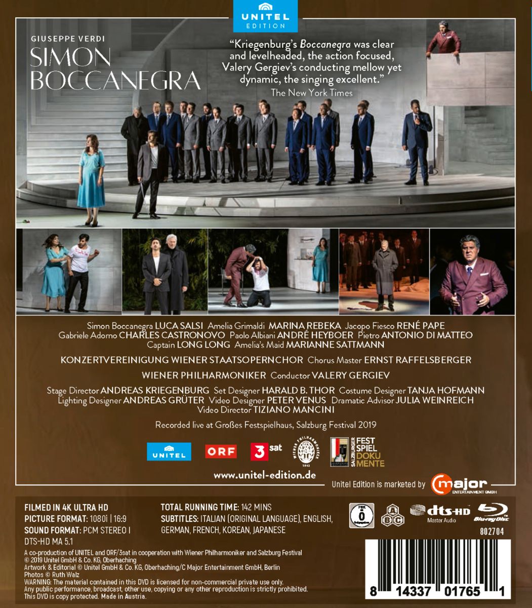 Es singt und spielt ein absolutes Weltklasse-Ensemble: Luca Salsi in der Titelrolle, René Pape als Fiesco sowie Marina Rebeka und Charles Castronovo als Liebespaar Amelia und Gabriele Adorno machen diese Aufführung zum absoluten Hörgenuss. Unter der Stabführung von Waleri Gergijew spielen die Wiener Philharmoniker auf höchstem Niveau. Es singt die sehr gut einstudierte Konzertvereinigung Wiener Staatsopernchor.