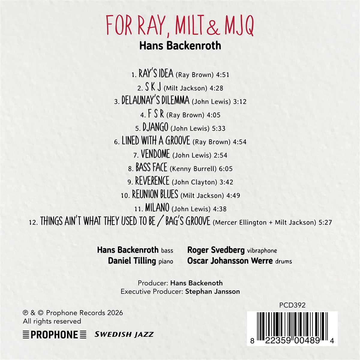 Der Bassist Hans Backenroth wird 60 Jahre alt und würdigt den Bassisten Ray Brown, der 100 Jahre alt geworden wäre, sowie Milt Jackson und das Modern Jazz Quartet, das Brown mitbegründet hat. In den späten 1940er Jahren war Ray Brown Bassist in Dizzy Gillespies Big Band, und es war die Rhythmusgruppe der Band – mit Brown am Bass, Milt Jackson am Vibraphon, John Lewis am Klavier und Kenny Clarke am Schlagzeug –, die den Grundstein für das Modern Jazz Quartet legte. Nach einigen Jahren verließ Brown das Quartett, um sein eigenes Trio zu gründen, das seine damalige Frau Ella Fitzgerald begleitete. Außerdem begann er eine Zusammenarbeit mit dem Pianisten Oscar Peterson. Mitte der 1960er Jahre zog Brown nach Los Angeles, wo er seinen Lebensunterhalt als Studiomusiker verdiente und als Manager für Quincy Jones und das Modern Jazz Quartet tätig war. Ray Brown nahm bereits in den 1950er Jahren Alben unter seinem eigenen Namen auf, aber erst in den 1980er Jahren leitete er konsequenter seine eigenen Gruppen. Ray Brown spielte immer aus Liebe zur Musik und war darüber hinaus ein unglaublicher Solist. Hans Backenroth spielt seit fast 40 Jahren mit praktisch allen großen Namen des schwedischen Jazz und ist die erste Wahl für eine Vielzahl ausländischer Solisten, die in Schweden einen Bassisten suchen. Und wie Ray Brown verfügt Backenroth über eine musikalische Bandbreite, die es ihm ermöglicht, sich in die meisten Kontexte einzufügen. Er hat einen vollen, warmen Basssound und ist ein ausgesprochen melodischer Solist. Für dieses Album hat er eine Reihe von Kompositionen ausgewählt, die mit Brown, Jackson und dem MJQ in Verbindung stehen – Blues, Swing, Bebop, Balladen und Kammerjazz mit Elementen der klassischen Musik. An Hans Backenroths Seite spielen Roger Svedberg (Vibraphon), Oscar Johansson Werre (Schlagzeug) und Daniel Tilling (Klavier).