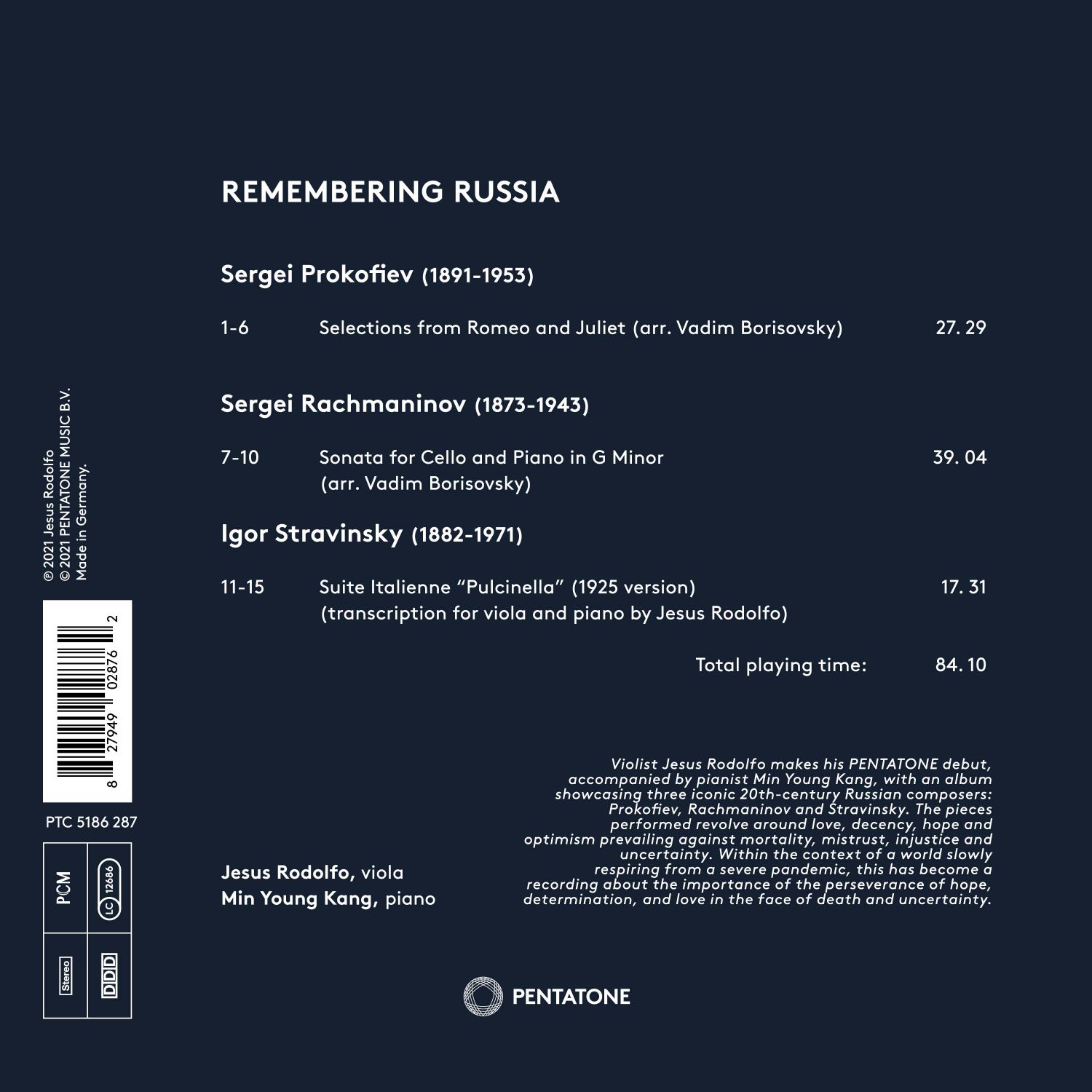 Der spanische Bratschist Jesus Rodolfo hat für sein Album „Remembering Russia“ Werke dreier berühmter russischer Komponisten des 20. Jahrhunderts zusammengestellt, die ihre Heimat verlassen haben: Prokofjew, Rachmaninow und Strawinsky. Die Stücke drehen sich um Liebe, Hoffnung und Optimismus, die sich gegenüber Sterblichkeit, Ungerechtigkeit und Unsicherheit durchsetzen. Vor dem Hintergrund einer Welt, die sich langsam von einer schweren Pandemie erholt, ist dies eine Aufnahme über die Bedeutung der Beharrlichkeit von Hoffnung, Entschlossenheit und Liebe in ungewissen Zeitengeworden. Rodolfo wird vom Pianisten Min Young Kang begleitet.