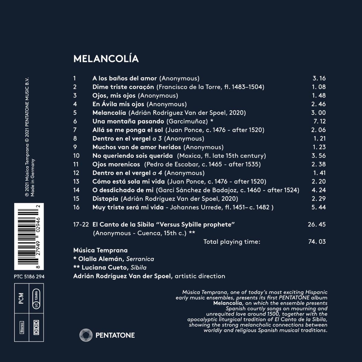 Música Temprana, eines der derzeit aufregendsten Ensembles für Alte Musik aus Spanien und Lateinamerika, stellt auf seinem Album „Melancolía“ höfische Lieder Spaniens über Trauer und unerwiderte Liebe der apokalyptischen liturgischen Tradition des „Canto de la Sibila“ gegenüber. Viele der hier aufgeführten Villancicos, Canciones, Romanzen und Estrambotes sind in Gesangbüchern wie dem berühmten Cancionero Musical de Palacio dokumentiert. Sie zeigen den Übergang von der Lyrik der Troubadoure zum blühenden Siglo de Oro, gleichzeitig den Übergang von einer mittelalterlichen zu einer Renaissance-Ästhetik.