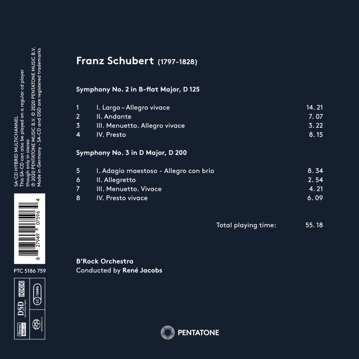 Der vielfach preisgekrönte Dirigent René Jacobs und das B'Rock Orchestra setzen ihren Schubert-Zyklus mit einer Aufnahme der zweiten und dritten Sinfonie des Wiener Komponisten fort. Jacobs nähert sich diesen Stücken als symphonisches Paar, das kontrastierende Aspekte der Persönlichkeit und des kompositorischen Ansatzes Schuberts offenbart. Die zweite Sinfonie ist ernst, ehrgeizig und will Beethoven ‚übertrumpfen‘, während die dritte absichtlich unheroisch ist: leicht, lyrisch und voller italienisierender Elemente. Interessanterweise erkennt Jacobs einen vergleichbaren Tandem-Ansatz in Schuberts vierter und fünfter Sinfonie, die der nächste Beitrag zu diesem Aufnahmeprojekt bilden werden. Die Musiker des belgischen B'Rock Orchestra präsentieren die Werke auf historischen Instrumenten, transparent, aber voller Feuer.
