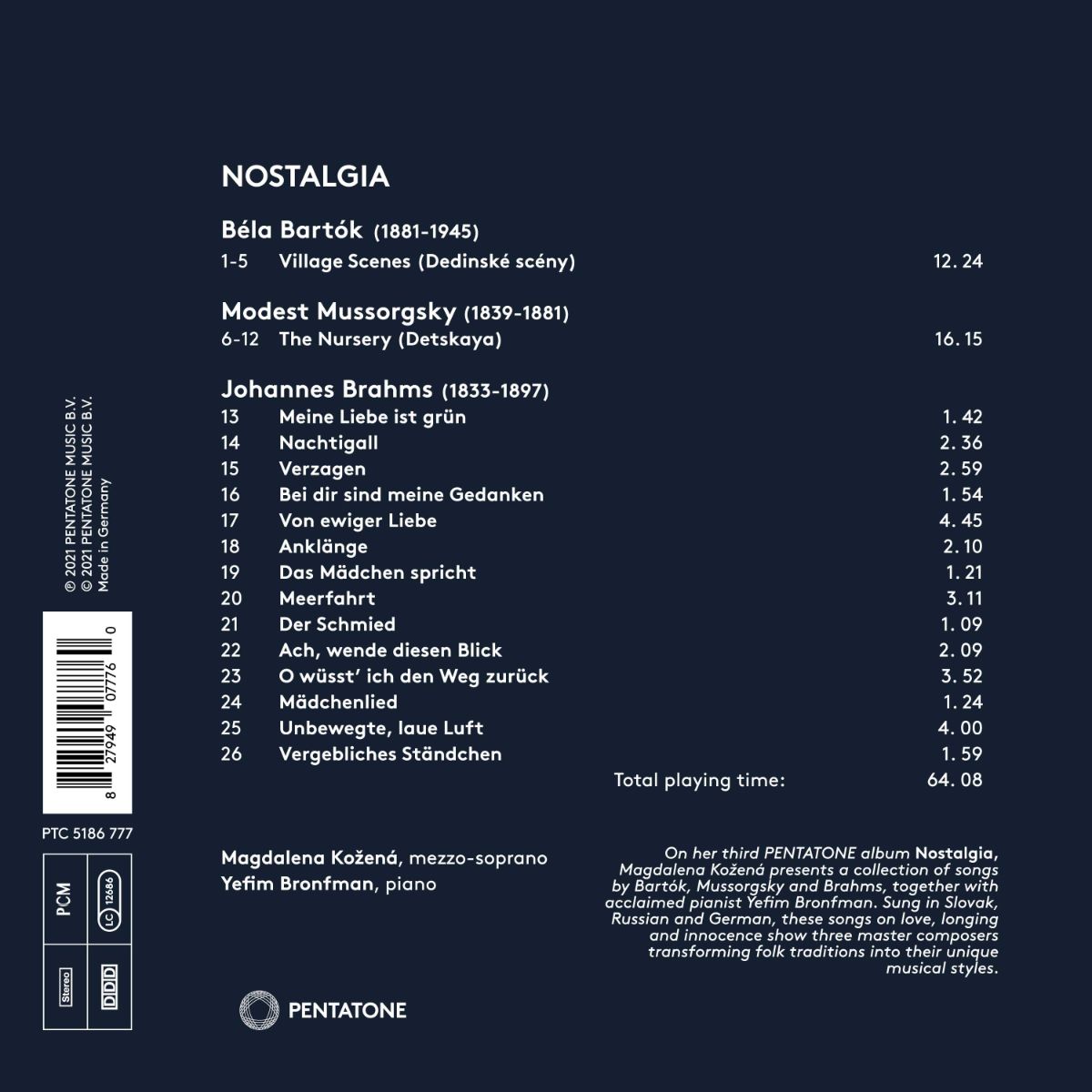 Auf „Nostalgia“ präsentiert Magdalena Kožená Béla Bartóks „Dorfszenen“, Modest Mussorgskys „Kinderstube“ und eine Auswahl an Liedern von Johannes Brahms. Diese in slowakischer, russischer und deutscher Sprache gesungenen Lieder über Liebe, Sehnsucht und Unschuld zeigen, wie die drei Komponisten ihre jeweilige Volkstraditionen in den eigenen Musikstil integrierten. Magdalena Kožená erweist sich einmal mehr als begnadete Liedinterpretin. Diese Aufnahme mit dem gefeierten Pianisten Yefim Bronfman ist auch das Ergebnis einer zwei Jahrzehnte währenden künstlerischen Freundschaft.