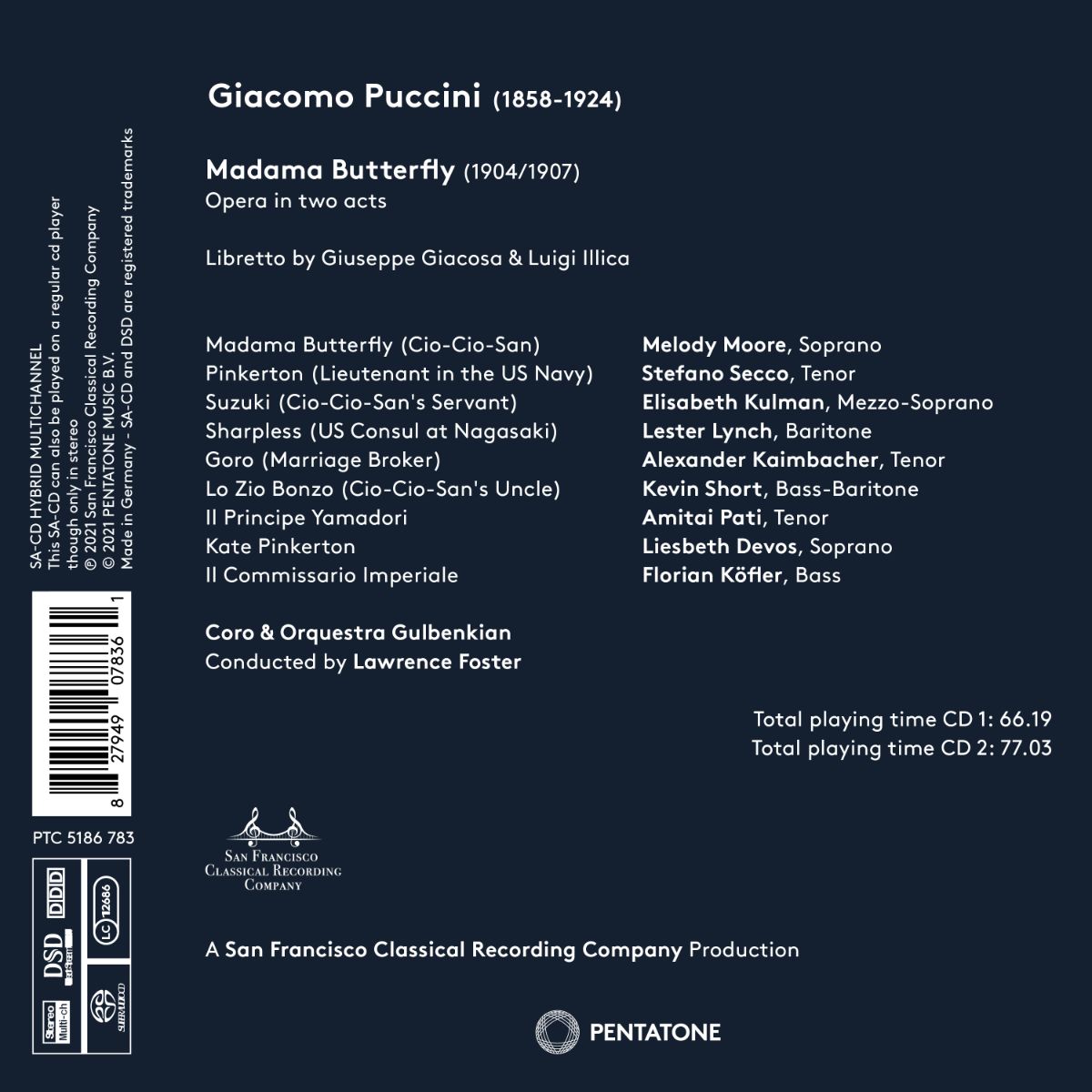 Nach der Einspielung von „La Fanciulla del West“ erweitert der Dirigent Lawrence Foster seine Puccini-Diskographie nun mit „Madama Butterfly“, zusammen mit dem Coro & Orquestra Gulbenkian so-wie Elisabeth Kulman (Suzuki), Stefano Secco (Pinkerton), Lester Lynch (Sharpless) und Melody Moore (Cio-Cio-San) in der Titelrolle. Lawrence Fosters Interpretation bringt den symphonischen Charakter der Oper zur Geltung, während Melody Moore mit ihrer charismatischen Interpretation der Titelrolle das tragische und dramatische Potenzial des Werks voll ausschöpft.