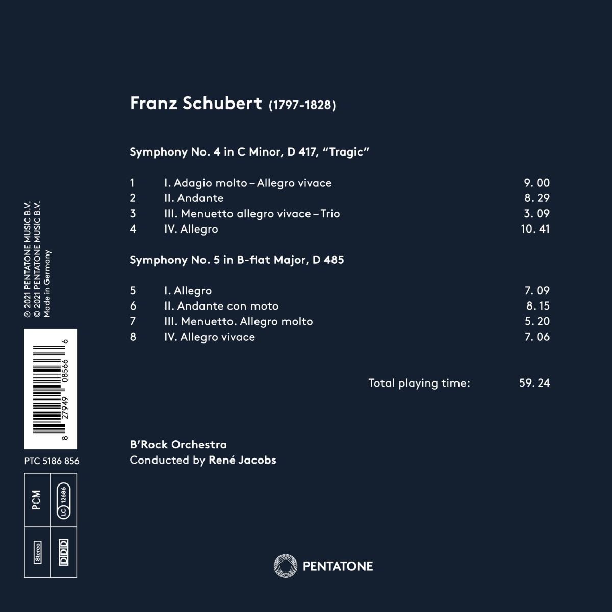 René Jacobs und das B'Rock Orchestra präsentieren den dritten Teil ihres Schubert-Zyklus mit Aufnahmen der Sinfonien Nr. 4 und 5. Genau wie bei der 2. und 3. Sinfonie nähert sich Jacobs diesen Werken als symphonisches Paar, das kontrastierende Aspekte von Schuberts Persönlichkeit und kompositorischem Ansatz offenbart. Die Vierte ist Schuberts erste Sinfonie in einer Moll-Tonart und deutet ein völlig neues harmonisches Weltbild an. Dagegen klingt die Fünfte mozartisch und heiter, obwohl diese Unbeschwertheit nur Schein ist, wie so oft in Schuberts Musik. Um es mit dem Maestro selbst zu sagen: „Zu leichter Sinn birgt meistens ein zu schweres Herz.“ Schaut man genauer unter die Oberfläche, werden die Querverbindungen zwischen der "tragischen" Vierten und der "leichteren" Fünften umso deutlicher.