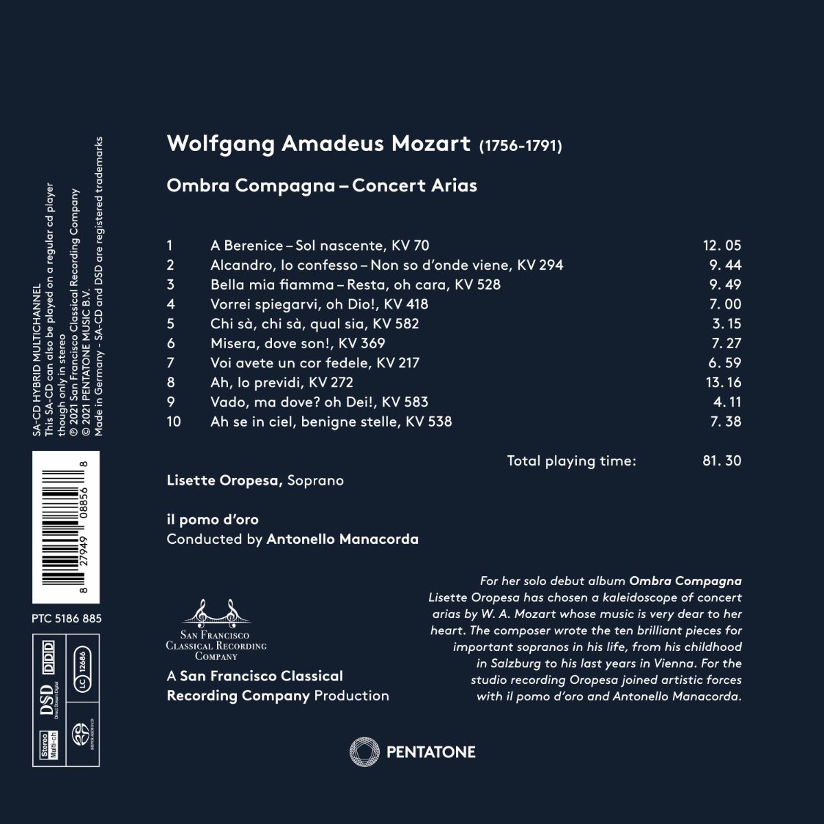 Die kubanisch-amerikanische Sopranistin Lisette Oropesa präsentiert auf ihrem Solo-Debütalbum „Ombra Compagna“ ein Kaleidoskop von Konzertarien von Mozart. Diese wurden für die bedeutendsten Sopranistinnen aus Mozarts Umfeld geschrieben. Sie enthalten die vielleicht opulenteste und virtuoseste Musik, die Mozart für Stimme und Orchester komponiert hat. Das emotionale Epizentrum des Albums ist das Rezitativ mit Arie „Ah, lo previdi“, in der die erhabenste Musik die Reise zwischen Leben und Tod begleitet, wenn der Geist eines geliebten Menschen diese Welt verlässt.