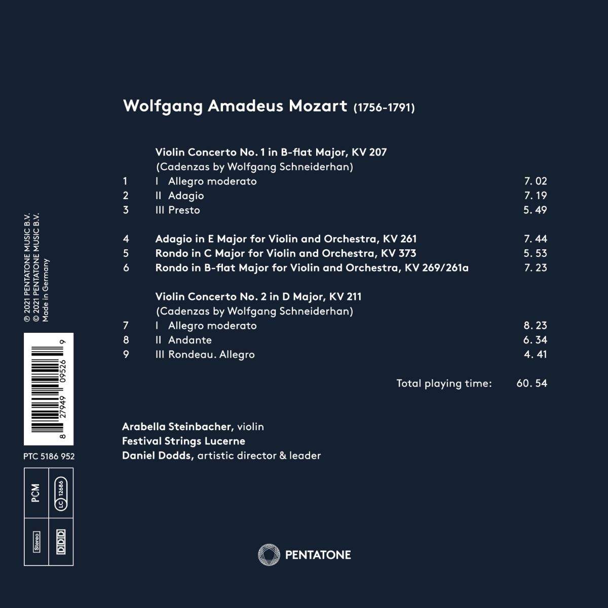 Nachdem Arabella Steinbacher, die Festival Strings Lucerne und ihr Leiter Daniel Dodds die letzten drei Violinkonzerte Mozarts 2014 einspielten, vervollständigen sie nun (endlich!) den Zyklus mit den weniger bekannten, aber ebenso bezaubernden Violinkonzerten 1 & 2 sowie dem Adagio in E-Dur und den Rondos in C-Dur und B-Dur. Arabella Steinbacher spielt zum ersten Mal auf der ‚Ex Benno Walter‘ Stradivari, auf der einst Joseph Szigeti spielte. Als Kadenzen wählte sie jene von Wolfgang Schneiderhan, der die Festival Strings Lucerne 1956 gemeinsam mit Rudolf Baumgartner gegründet hatte.