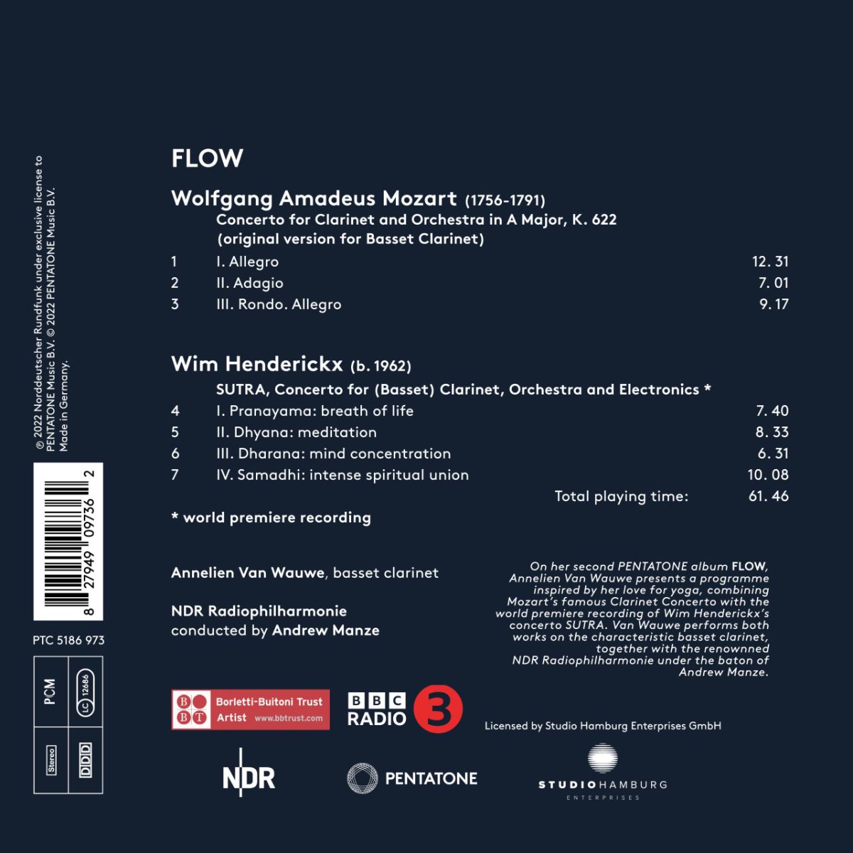 Die Opus-Klassik-Preisträgerin Annelien Van Wauwe präsentiert auf „Flow“ ein Programm, das von ihrer Liebe zum Yoga inspiriert ist. Auf dem Album kombiniert sie Mozarts berühmtes Klarinettenkonzert mit der Weltersteinspielung von „SUTRA“ einem Konzert für Bassettklarinette des zeitgenössischen belgischen Komponisten Wim Henderickx. Van Wauwe spielt beide Werke auf der charakteristischen Bassettklarinette, zusammen mit der renommierten NDR Radiophilharmonie unter der unter der Leitung von Andrew Manze. Beide Werke verbindet eine ausgeprägte Reinheit, Einfachheit, Originalität und perfekte musikalische Strukturen, ganz im Sinne des Yoga.