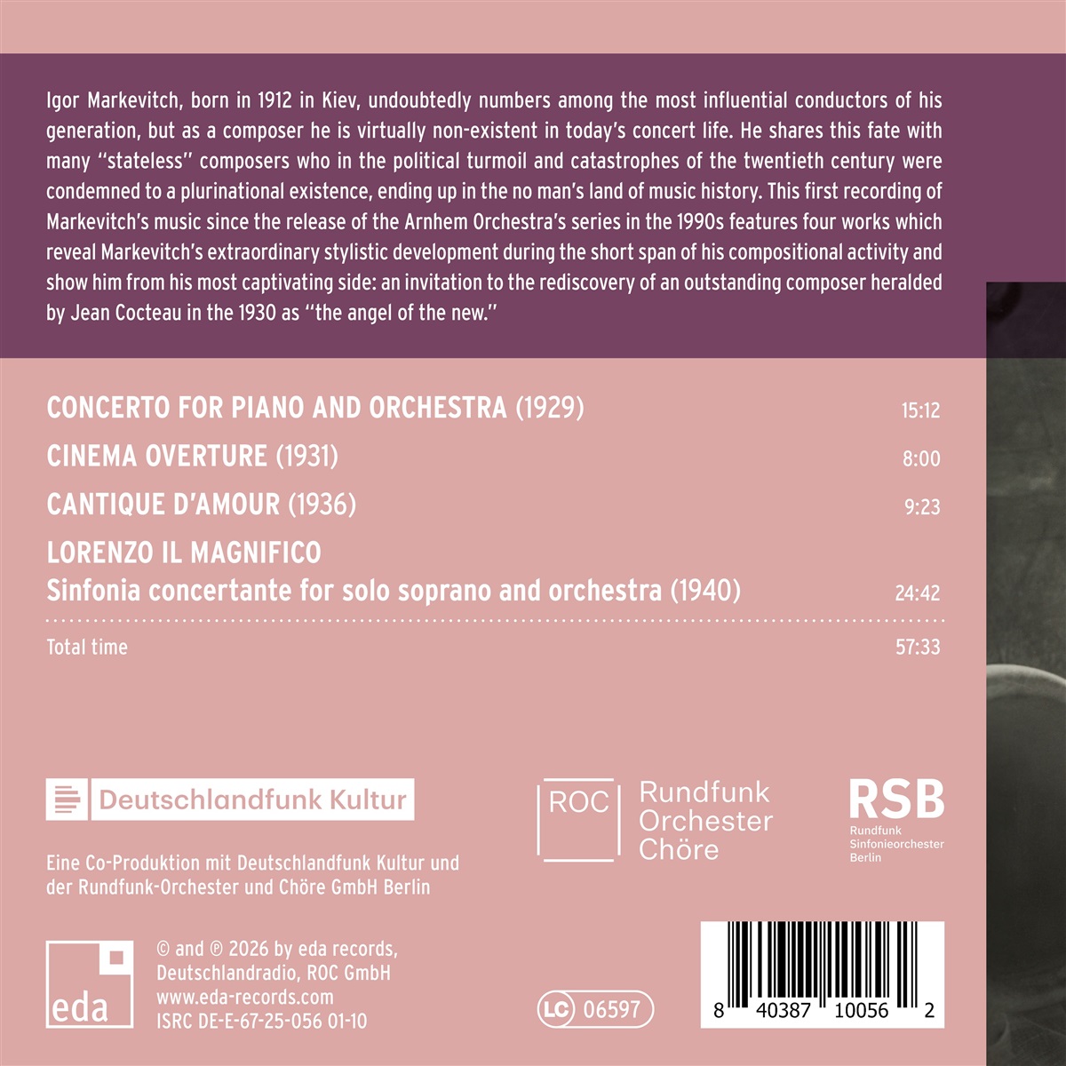 Diese erste Neuaufnahme von Markevitchs Musik seit rund 30 Jahren enthält vier Werke, die Markevitchs außergewöhnliche stilistische Entwicklung während seiner kurzen kompositorischen Tätigkeit von den 1920er bis in die 1940er Jahre offenbaren und ihn von seiner faszinierendsten Seite zeigen: das Klavierkonzert (1929). die „Cinema Overture“ (1931), der „Cantique d’Amour“ (1936) und die Sinfonia concertante für Sopran solo und Orchester „Lorenzo il Magnifico“ (1940). Das Album ist eine Einladung zur Wiederentdeckung eines herausragenden Komponisten, der von Jean Cocteau als ‚der Engel des Neuen‘ gepriesen wurde.