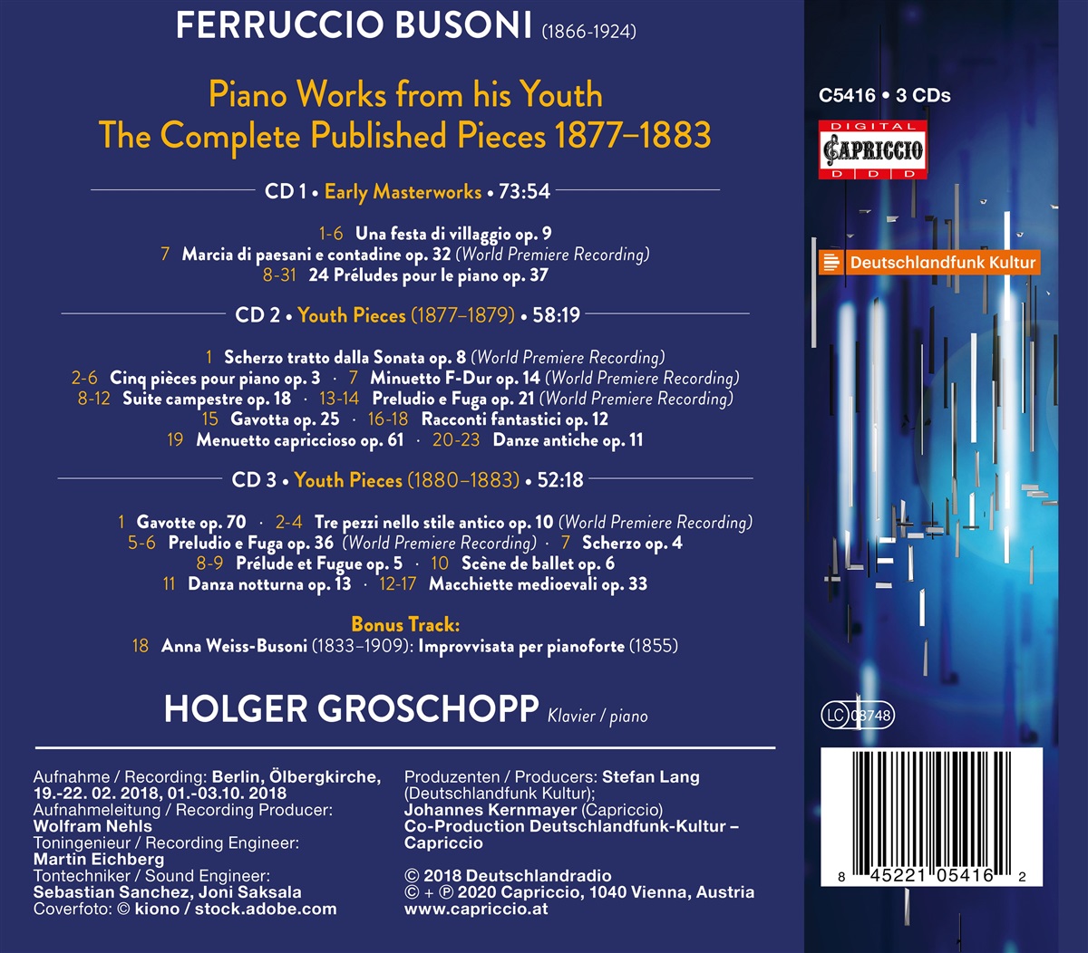 Ferruccio Busoni war fraglos das, was man ein echtes ‚Wunderkind‘ nennen darf. Seine erstaunliche Reife als jugendlicher Pianist lässt sich nur indirekt durch Zeitzeugenberichte belegen; in seinen frühen Kompositionen kann man allerdings die erstaunliche Beherrschung des Klaviers unmittelbar überprüfen.