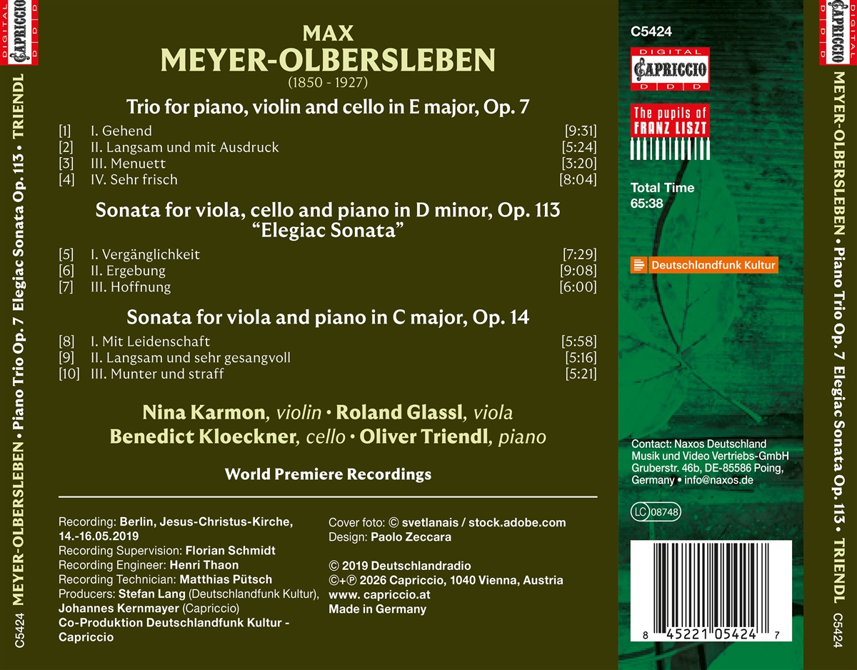 Max Meyer-Olbersleben, 1850 im thüringischen Olbersleben geboren, studierte an der Weimarer Orchesterschule unter Franz Liszt, sodann an der Königlichen Musikschule in München bei Gabriel Josef Rheinberger und Peter Cornelius. Als Professor für Kontrapunkt und Komposition wurde er in Würzburg ansässig und leitete als Direktor das Königliche Konservatoriums für Musik bis zu seiner Pensionierung 1920. Noch zu Lebzeiten erschienen 114 Werke im Druck, wobei er eher die kleinen Formen wie Chorwerke, Lieder und Klavierstücke bediente. Durch seine Ausbildung in Weimar und München war Meyer-Olbersleben sowohl mit den traditionalistischen wie den neudeutschen Strömungen der Musik jener Jahre vertraut und so zeugen die hier erstmals eingespielten kammermusikalischen Juwelen von tiefer, romantischer Empfindung und dem Geist eines neuen, musikalischen Aufbruchs. Die Werke werden von Musikern gespielt, die als Solisten sehr bekannt sind, auch über die Landesgrenzen hinaus: Nina Karmon (Violine), Roland Glassl (Bratsche), Benedict Kloeckner (Cello) und Oliver Triendl (Piano).
