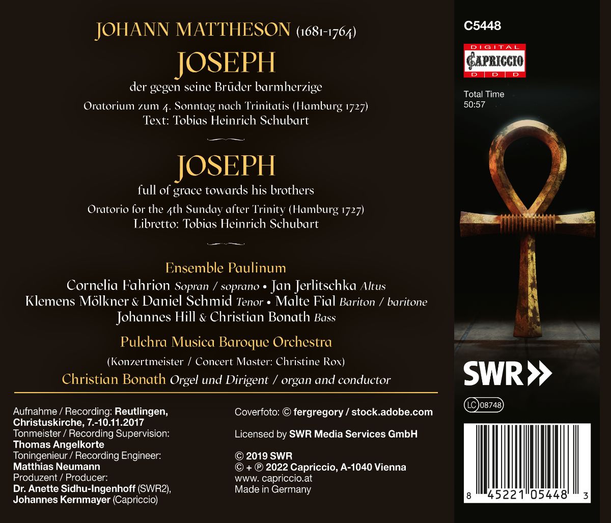 1715 wurde Johann Mattheson Musikdirektor am Hamburger Dom und nutzte so die Möglichkeit, geistliche Musik mit dem theatralischen Stil zu vermischen. Damit war er ein Pionier des „galanten Stils“: Für ihn hatte die Musik keinen theologischen, sondern einen sozial Aspekt; sie sollte dem Menschen und nicht (nur) Gott dienen. In seinen 13 Dienstjahren verfasste er 24 Oratorien für hohe Festtage und die Fastenzeiten. Die Gesangspartien sind dabei stets anspruchsvoll disponiert, wurden sie doch für die Solisten der Hamburger Gänsemarktoper geschrieben. Das Oratorium „Der gegen seine Brüder barmherzige Joseph“ wurde 1727 uraufgeführt.