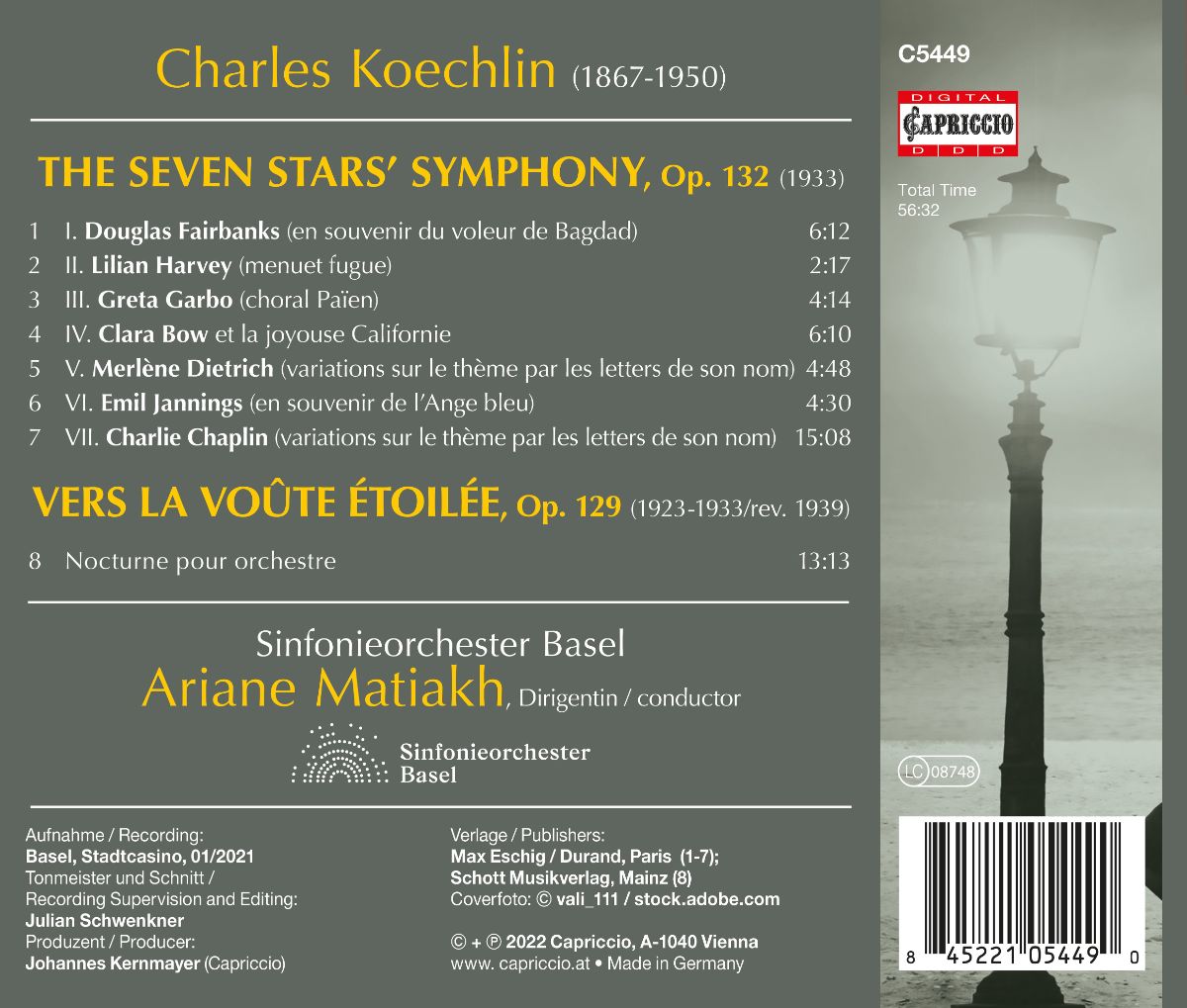 Musik des sträflich unterschätzen Komponisten Charles Koechlin ist immer wieder eine Entdeckung wert. Man fragt sich, warum sie nicht viel öfter gegeben und aufgenommen wird? Angesichts des Titels „Seven Stars Symphony“ mag man an ein Planeten-Werk à la „The Planets“ von Gustav Holst denken, doch in Wirklichkeit sind es Porträts der Lieblings-Filmstars Koechlins, die er mit feinem Pinsel, Witz und Humor, nicht ohne Tiefgang in sieben sinfonischen Sätzen verewigte. Ebenso enthalten: Koechlins „echtes“ Himmelswerk: „Vers la voûte étoilee“.