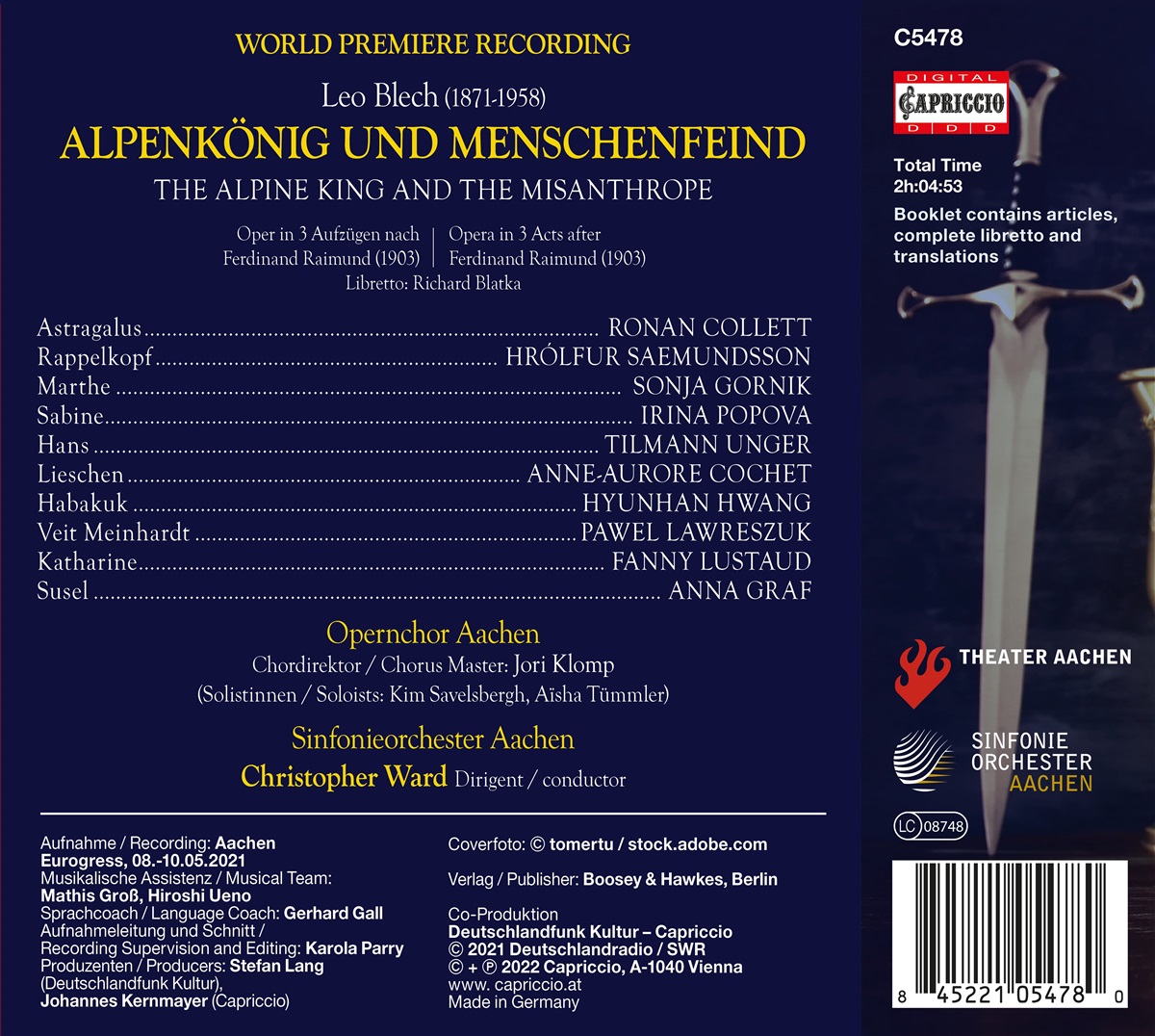 Um 1902 schnappten sich Leo Blech und sein Librettist Richard Batka das Sujet des romantischkomischen Original-Zauberspiels vom Wiener Ferdinand Raimund, entrümpelten es und machten daraus Blechs fünfte Oper. Ein jähzorniger Misanthrop terrorisiert mit seinem paranoiden Misstrauen seine Familie und Angestellten und wird erst geheilt wenn er durch magischen Rollenwechsel sein eigenes Verhalten von Außen betrachten muss. Dramatische Oper trifft Bauerntheater mit unerwartet süffiger Musik die, organisch instrumentiert, dem Ohr schmeichelt. Die Uraufführung am Dresdner Hoftheater wurde ein Sensationserfolg. Dann kam das Verbot all seiner Musik und nach dem Nazi-Spuk wurde sie nie wieder rehabilitiert. Jetzt kann man hören, was wir dadurch verpasst haben.