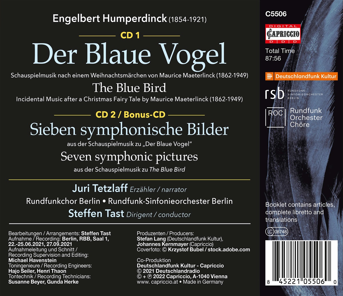 Nachdem sich Maurice Maeterlinck mit Pelléas et Mélisande und Ariane et Barbe-Bleue schon als ergiebige Opernstoffquelle erwiesen hatte, war es kein Wunder, dass sein Theaterstück Der Blaue Vogel (L’Oiseau bleu, 1908) auch bald musikalisch verarbeitet wurde. Max Reinhardt adaptierte das Werk als Weihnachtspiel für seine Berliner Bühne und zwar mit Szenenmusik von keinem geringerem als Engelbert Humperdinck. Diese Musik fristete ein unveröffentlichtes Dasein, bis Steffen Tast, Geiger im Rundfunksinfonieorchester Berlin sie wieder hörbar machte.