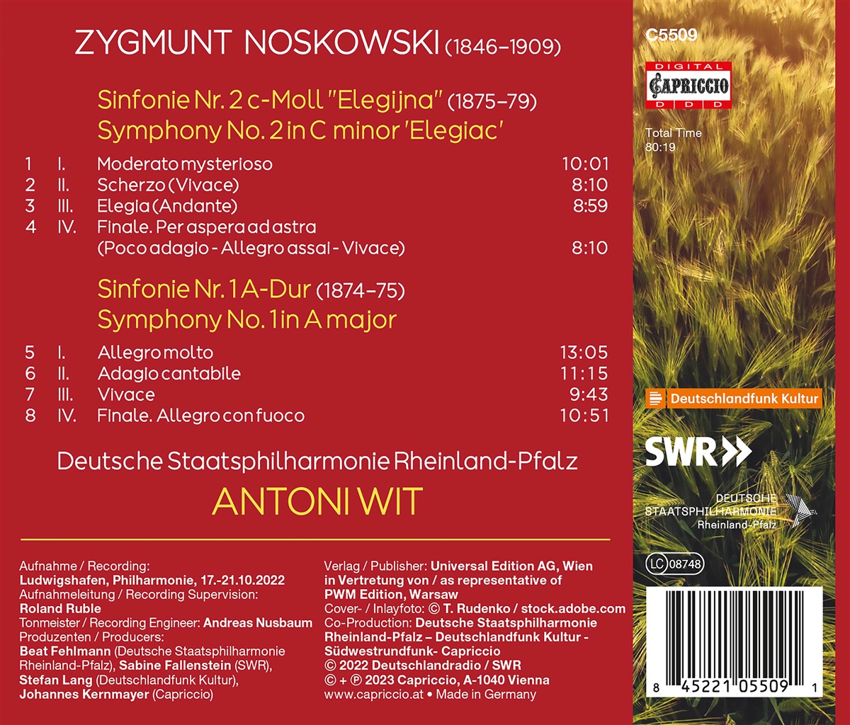 Trotz seiner berühmten Schüler (u. a. Karol Szymanowski) und seines bekannten Lehrers (Stanis?aw Moniuszko) haben dennoch bisher nur wenige Musikliebhaber von Zygmunt Noskowski gehört. Und doch war er über weite Strecken des 19. Jahrhunderts der bedeutendste Vertreter moderner sinfonischer Musik in Polen. Antoni Wit, der auf diesem Album die Deutsche Staatsphilharmonie Rheinland-Pfalz dirigiert, ist ein Fürsprecher vergessener polnischer Komponisten. Nun kümmert er sich um den Ruf des hochromantischen Zygmunt Noskowski, wie er das auch schon für Zygmunt Stojowski getan hat.