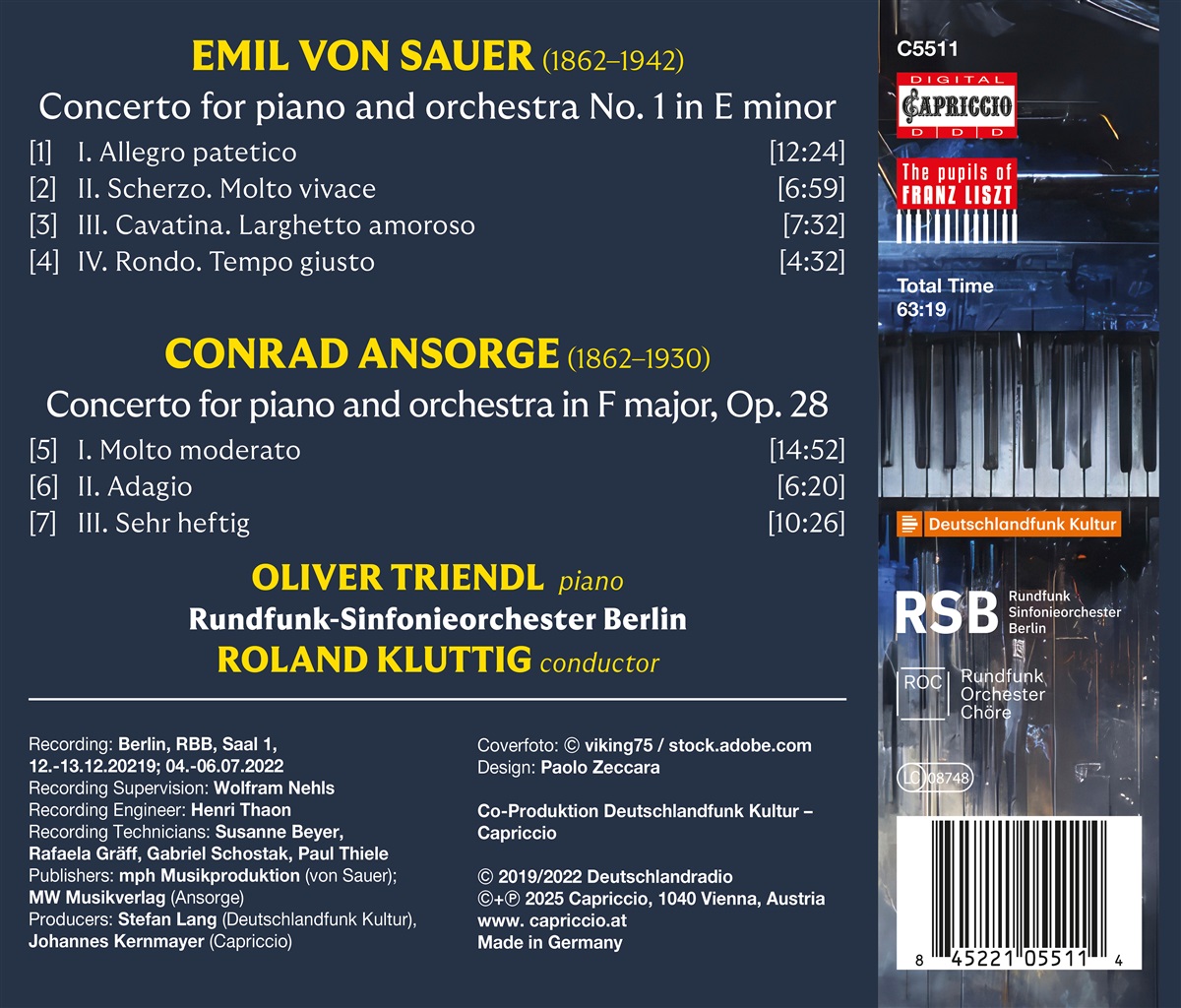 Sowohl Emil von Sauer als auch Conrad Ansorge genossen das Privileg beim seinerzeit bereits weltberühmten Franz Liszt zu studieren. Liszt selbst sah sich nie als Professor im herkömmlichen Sinne, er wollte vielmehr als Berater oder Gestalter gesehen werden. Dennoch prägten die Unterrichtsstunden bei Liszt nachhaltig den weiteren musikalischen Werdegang der beiden Studenten. Dieser Aufnahme präsentiert zwei hoch virtuose und zu Unrecht vergessene Klavierkonzerte, die auch ein tiefes Verständnis für musikalische Formen und Strukturen der beiden Liszt-Schüler erkennen lassen. Pianist Oliver Triendl ist ein engagierter Fürsprecher für in Vergessenheit geratene Komponisten. Er arbeitete schon mit vielen renommierten Solisten und Klangkörpern zusammen wie dem Rundfunk-Sinfonieorchester Berlin, dem Mozarteum-Orchester Salzburg, Ana Chumachenko, Baiba Skride und dem Mandelring Quartett. Es spielt das Rundfunk-Sinfonieorchester Berlin unter der Leitung von Roland Kluttig.