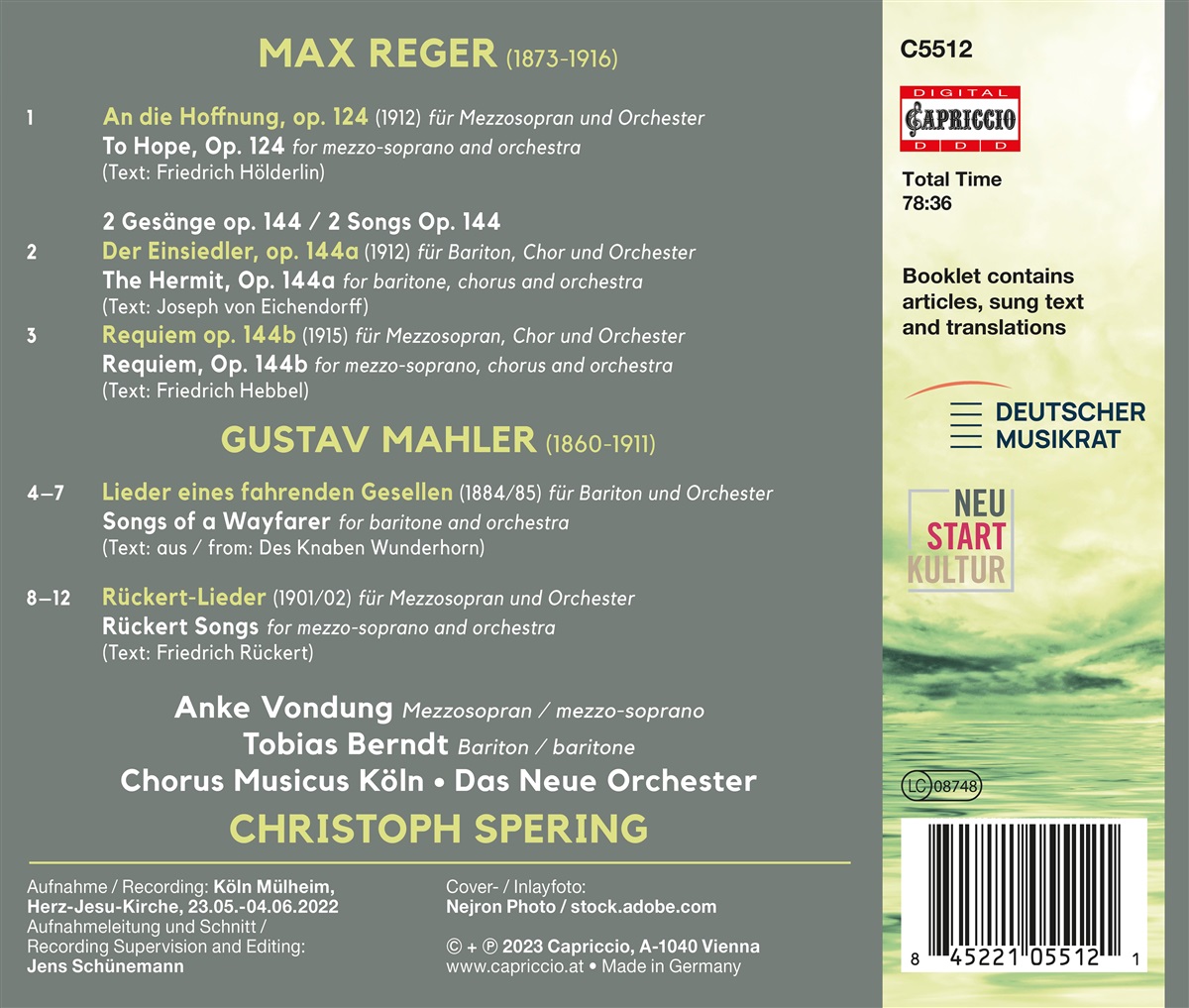 Zum 150. Geburtstag von Max Reger präsentieren Das Neue Orchester und der Chorus Musicus Köln unter der Leitung von Christoph Spering einige seiner wenig bekannten Solo- und Chor-Orchesterkompositionen. Wie nicht selten in Regers Schaffen, sind auch in diesen Kompositionen religiös-transzendierende Komponenten in Gestalt von Choralzitaten enthalten. Reger bewegte sich ganz im Stil der Zeit: Der große Gedanke, der in Opern seiner Epoche keinen Platz gehabt hätte, wird in den Konzertsaal übertragen. Das Hebbel-Requiem op. 144b weist hörbare Parallelen zu Brahms‘ Requiem auf. Ergänzt wird das Album durch Orchesterlieder von Gustav Mahler. Zu hören sind die „Lieder eines fahrenden Gesellen“ und die „Rückert-Lieder“.