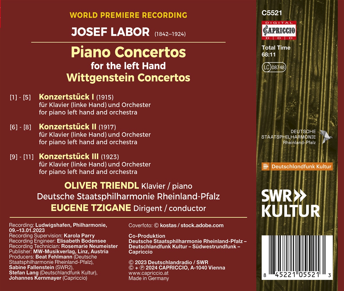 Neben den bereits bekannten Klavierkonzerten für die linke Hand und Orchester von Korngold, Ravel oder Prokofieff, war es vor allem der Wiener Komponist Josef Labor, dessen erstes Konzertstück von 1915 den Beginn dieses erstaunlichen Genres einläutete. Paul Wittgenstein, der im Krieg seinen rechten Arm verlor aber dennoch gewillt war seine pianistische Karriere fortzusetzen, beauftragte noch in Kriegsgefangenschaft Josef Labor ein entsprechendes Werk zu schreiben. Labors Musik ist technisch brillant komponiert, dabei stets klangsinnlich und melodisch und offenbar genau nach Wittgensteins Gusto. So schrieb Josef Labor insgesamt 10 Werke für den Linkspianisten Wittgenstein, von denen die drei „Konzertstücke“ nun in Weltersteinspielungen vorliegen.