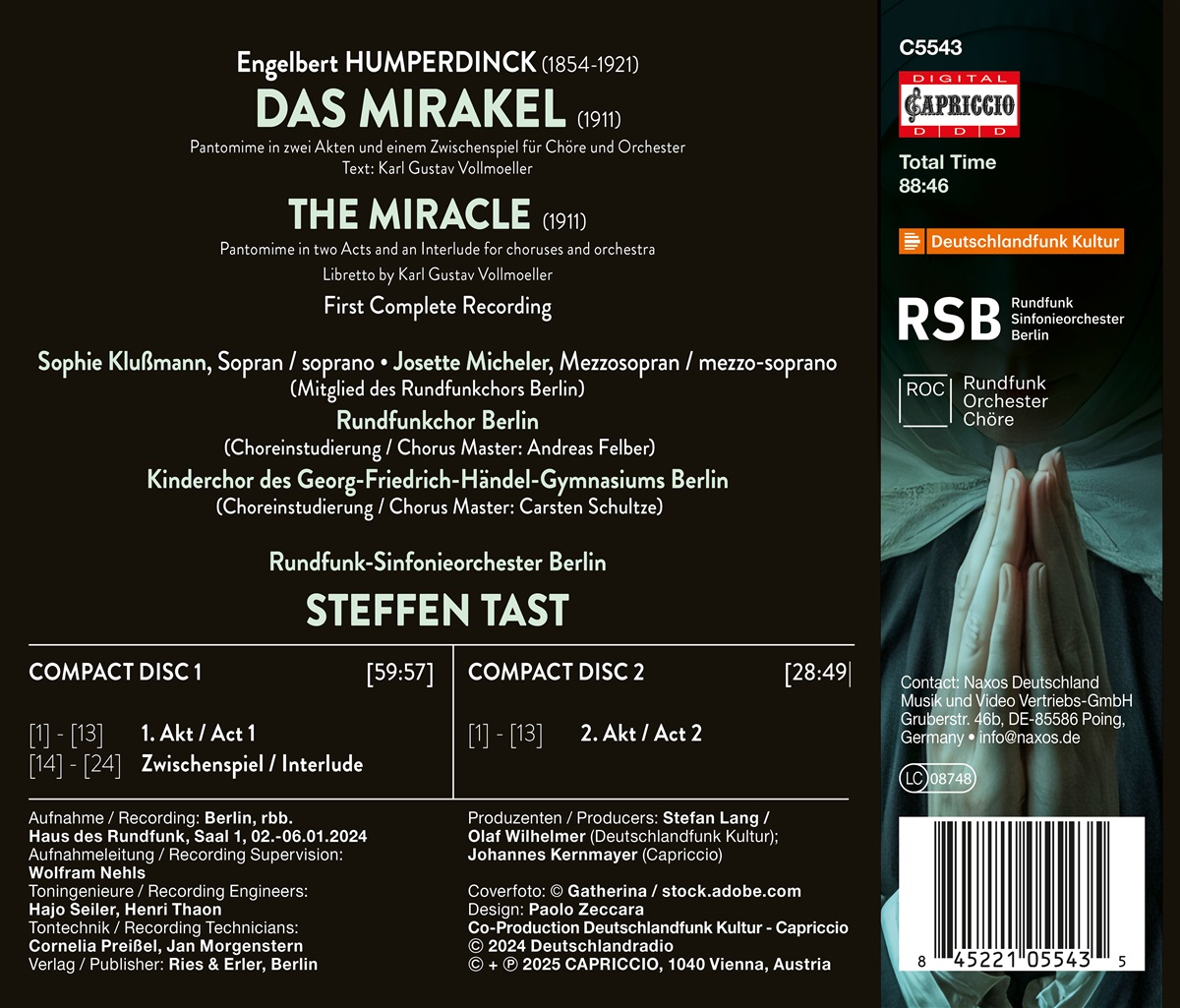 Engelbert Humperdincks Musik zu der Pantomime des wohl bedeutendsten Bühnenwerks Karl Gustav Vollmoellers „Das Mirakel“ beeindruckt mit seiner tiefromantischen Klangsprache, den groß besetzten Chorszenen und führte bislang im Schaffenskatalog des Komponisten ein unverzeihliches Schattendasein. Uraufgeführt in London 1911 adaptierte kein Geringerer als Max Reinhardt dieses Werk für den Film (1912) und inszenierte zahlreiche Aufführungen mit hunderten von Darstellern, Statisten und Tänzern – letztendlich auch 1925 bei den Salzburger Festspielen. Mit dieser Aufnahme liegt nun erstmals eine Gesamteinspielung des tief romantischen Meisterwerks vor. Steffen Tast dirigiert das Rundfunk-Sinfonieorchester Berlin und gleich zwei Chöre singen im Zwischenspiel, nämlich der Rundfunkchor Berlin und der Kinderchor des Georg-Friedrich-Händel-Gymnasiums in Berlin sowie die international bekannte Sopranistin Sophie Klussmann und die Mezzosopranistin Josette Micheler.