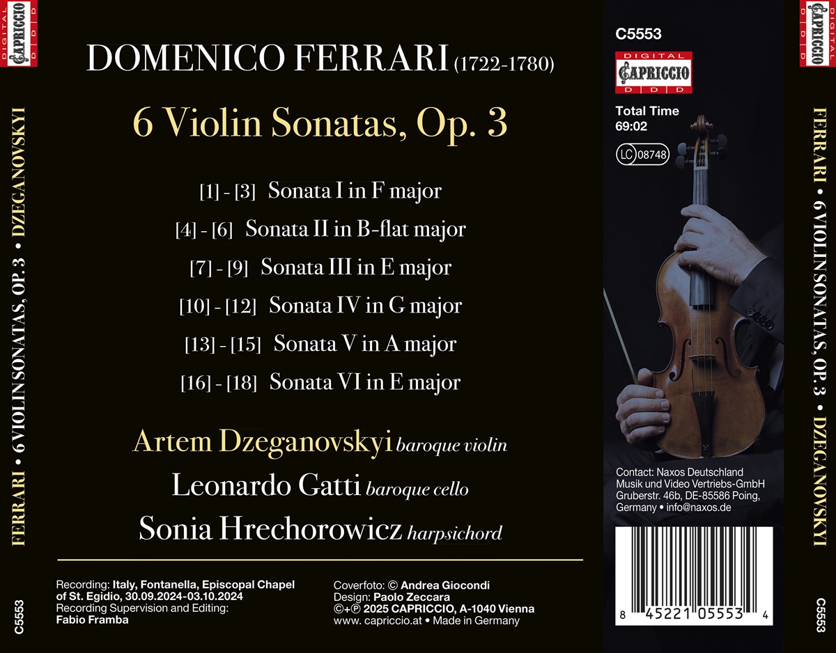 In der zweiten Hälfte des 18. Jahrhunderts war Domenico Ferrari (1722–1780) absolut kein Unbekannter. Er wurde hofiert als hoch talentierter Geigenvirtuose wie auch als galanter Komponist. Als einer der besten Schüler Giuseppe Tartinis schaffte er es kurzerhand an den Wiener- sowie den Württembergischen Hof in Stuttgart. Nach seinem Debut 1754 bei den berühmten Concert Spirituel in Paris, erhielt er das königliche Privileg seine Werke in Frankreich zu veröffentlichen, wo er auch bis zu seinem Tode blieb. Sein auf dieser CD präsentiertes Op. 3 mit 6 Sonaten für Violine und Basso continuo entstand um 1760 und fasziniert mit einer virtuosen Klangsprache von Spätbarock und Klassik. Artem Dzeganovskyi spielt die Barock-Violine, Leonardo Gatti das Barock-Cello und Sonia Hrechorowicz ist die Harfenistin.