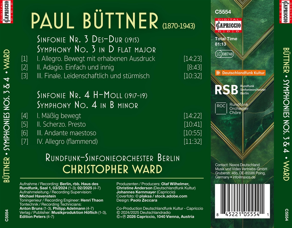 Paul Büttner, geboren 1870 in Dresden, studierte am dortigen Musikkonservatorium Violine und Oboe. Über die Jahre hinweg machte er sich einen hervorragenden Ruf als ausgezeichneter Musiker. Aber erst 1915, als seine 3. Sinfonie von keinem geringeren als Arthur Nikisch erfolgreich uraufgeführt wurde, sprach die internationale Musikszene von einem verheißungsvollen Komponisten der Moderne, als Nachfolger von Anton Bruckner und Johannes Brahms. Dazu verhalf auch die 1917 ebenso äußerst erfolgreiche Uraufführung seiner 4. Sinfonie. Doch 1933 stufte das Regime seine Musik als ‚entartet’ ein und verbannte den Komponisten samt seiner Werke von jeglicher öffentlichen Aufmerksamkeit. Christopher Ward dirigiert das Rundfunk-Sinfonieorchester Berlin.