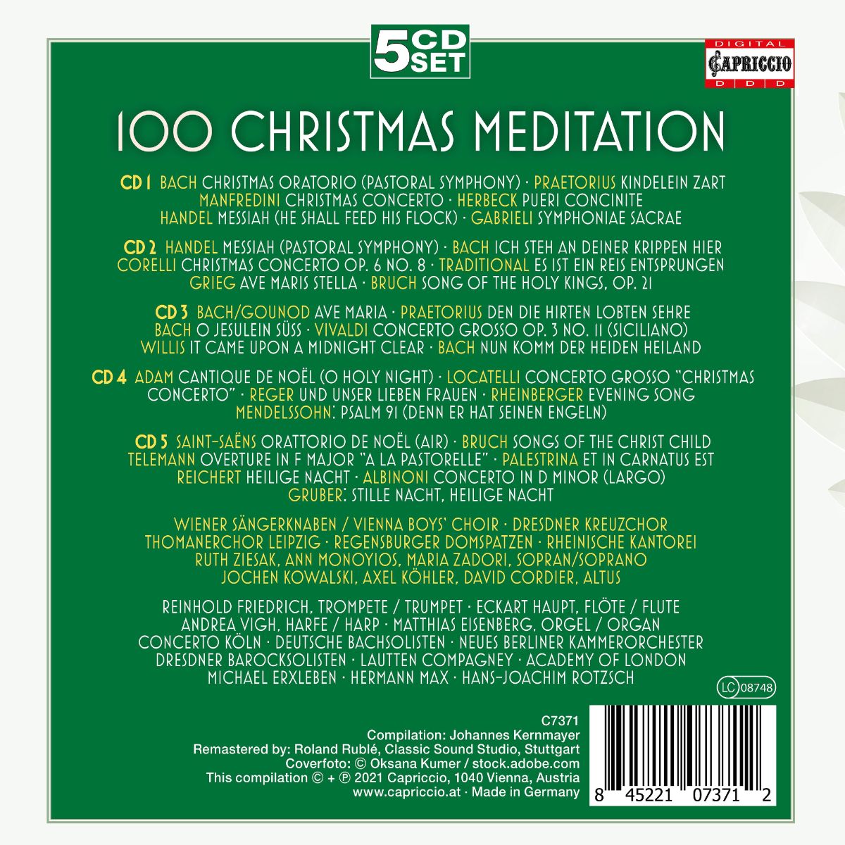 Meditation zu Weihnachten: Klingt das nicht wie eine ferne Erinnerung aus einer vergessenen Zeit? Die namentlich stille Zeit des Jahres ist freilich oft genug die lauteste, in der Musikalisches überall präsent zu sein scheint. Ein klingender, singender, swingender Popschmalz-Soundtrack zum allgegenwärtigen Konsumrausch. Auf „Christmas Meditation“ sind 100 wirklich besinnliche und entspannende klassische Weihnachtstitel zusammengefasst, interpretiert von berühmten Chören und Solisten. Von Bach, Händel und Praetorius über Corelli, Manfredini und Locatelli bis zu Bruch, Mendelssohn und Gruber.