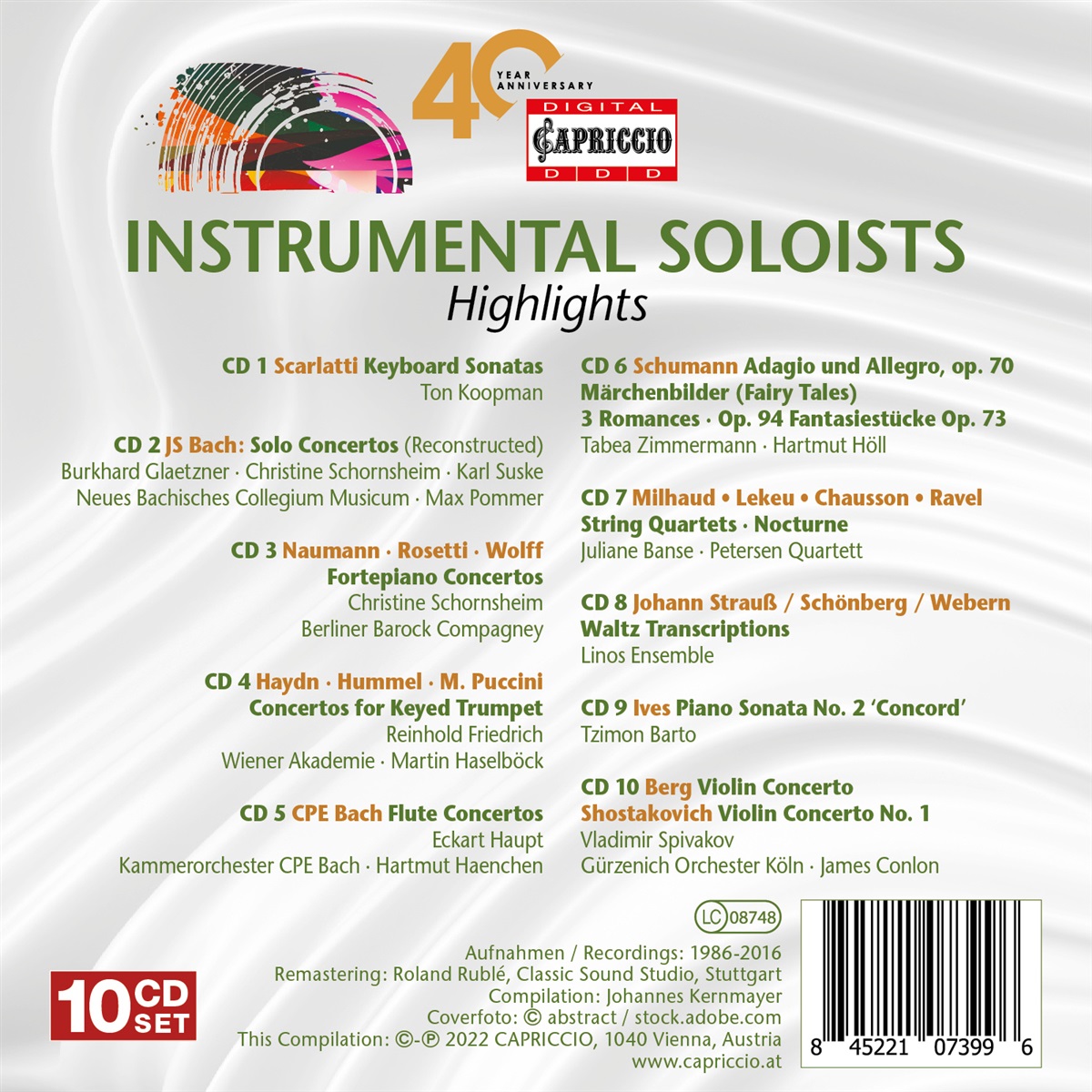 Capriccio feiert sein 40-jähriges Bestehen mit dieser Retrospektive einiger der erfolgreichsten Instrumentalaufnahmen aus dem Back-Katalog. Das „Line-Up“ dieser Sammel-Edition liest sich wie ein Who-is-who der mitteleuropäischen Klassikszene der letzten vier Jahrzehnte: Ton Koopman, Tabea Zimmermann, Vladimir Spivakov, Tzimon Barto, Christine Schornsheim, Burkhard Glaetzner, Eckart Haupt, Reinhold Friedrich, das Petersen Quartett und das Linos Ensemble. Im Ergebnis ist die Box eine großzügige und preislich attraktive Zusammenfassung dessen, was bei diesem beherzten, neugierigen Label immer schon im Fokus stand.