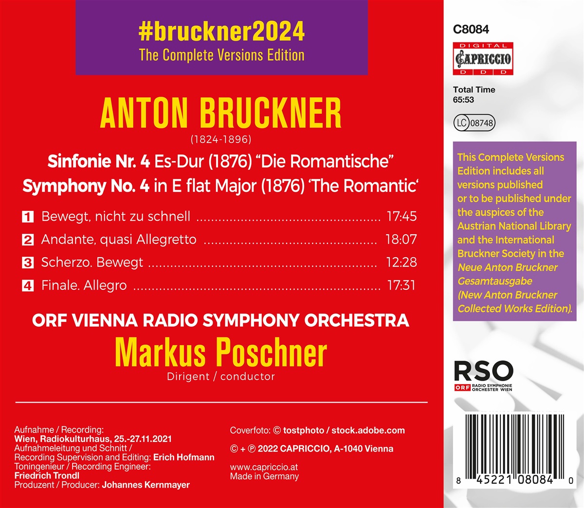 Unbeirrt arbeiten Markus Poschner und sein Team an der Aufnahme aller elf Bruckner-Sinfonien in sämtlichen verfügbaren Versionen. Hier kommt die 1876er Fassung der Sinfonie Nr. 4 - tatsächlich fand man inzwischen heraus, dass Bruckner 1876 noch kleine Veränderungen an dieser Version vornahm, die aber nicht zur Umarbeitung auf die 1878er-Fassung gehören und hier erstmals zu Gehör gebracht werden.