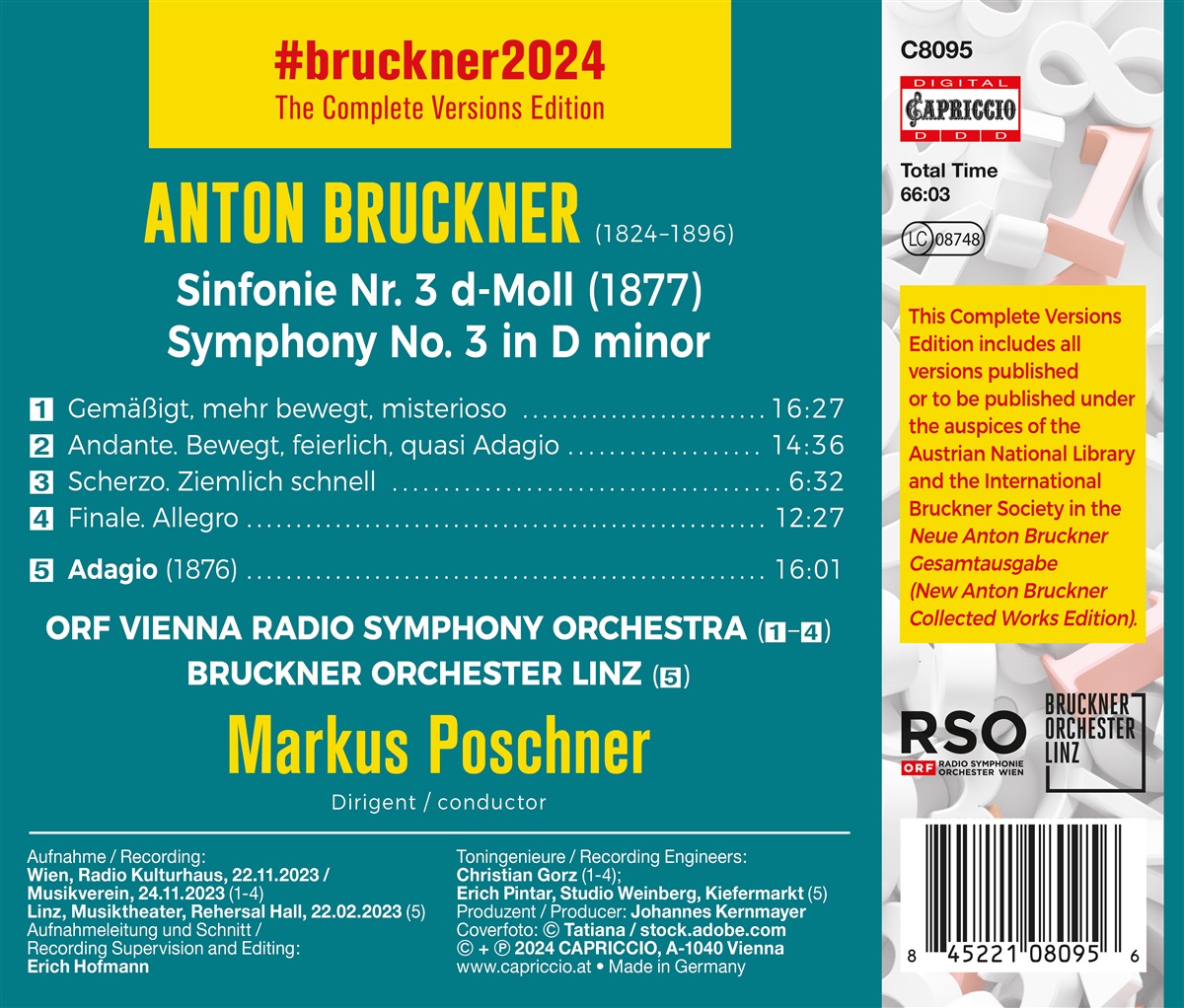 Nach dem Anton Bruckner seine fünfte Sinfonie vollendet hatte machte er sich 1876 umgehend an die Arbeit, seine bislang erfolglose dritte Sinfonie umzuarbeiten, um diese 1877 abermals den Wiener Philharmonikern für eine eventuelle Aufführung vorzuschlagen. Trotz einer weiteren Absage wurde die Sinfonie schließlich doch aufgeführt, jedoch völlig erfolglos. Trotzdem bot der Verleger Theodor Rättig an, das Werk zu veröffentlichen: So wurde daraus die erste Publikation einer Bruckner-Sinfonie. Das Album enthält zusätzlich eine frühere Fassung des Adagio („Adagio 2“) von 1876, gespielt vom Bruckner Orchester Linz.