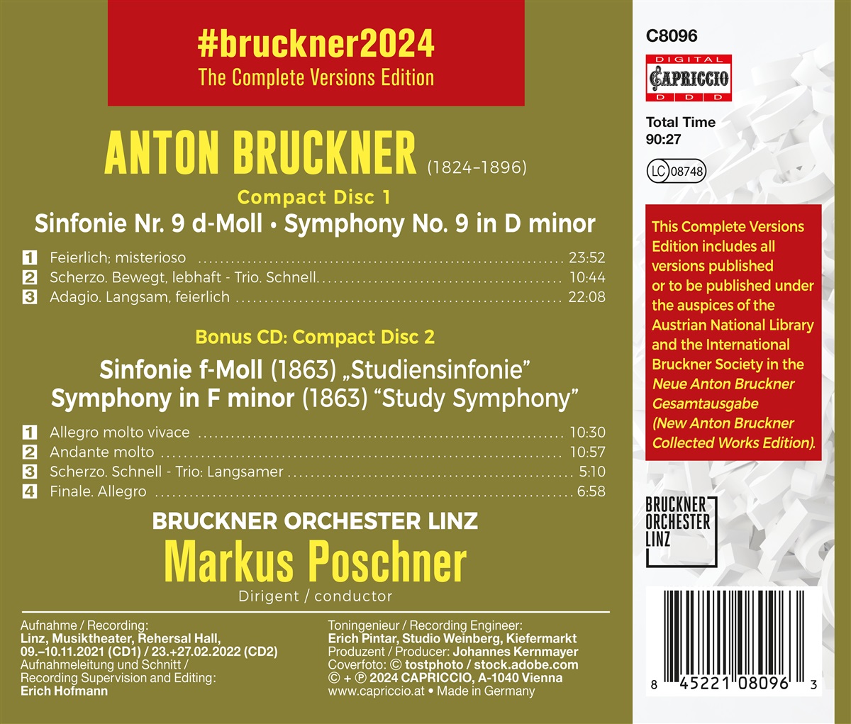Mit der 17. und damit letzten Veröffentlichung der umfassenden #bruckner2024-Reihe mit allen Bruckner-Sinfonien in den Fassungen der „Neuen Anton Bruckner Gesamtausgabe“, präsentiert das Bruckner Orchester Linz unter Markus Poschner die allererste und letzte Sinfonie des Linzer Meisters. Die frühe f-Moll Sinfonie ist Bruckners „Gesellenstück“. Sie steht noch ganz in der Tradition der Wiener Klassik und frühen Romantik von Beethoven, Schubert, Mendelssohn und Schumann. Bruckners neunte Sinfonie hingegen erscheint vielen als Krönung seiner Schöpfungen; sie ist auf jeden Fall seine progressivste, modernste, und dank des fehlenden Finales, auch mysteriöseste Sinfonie.