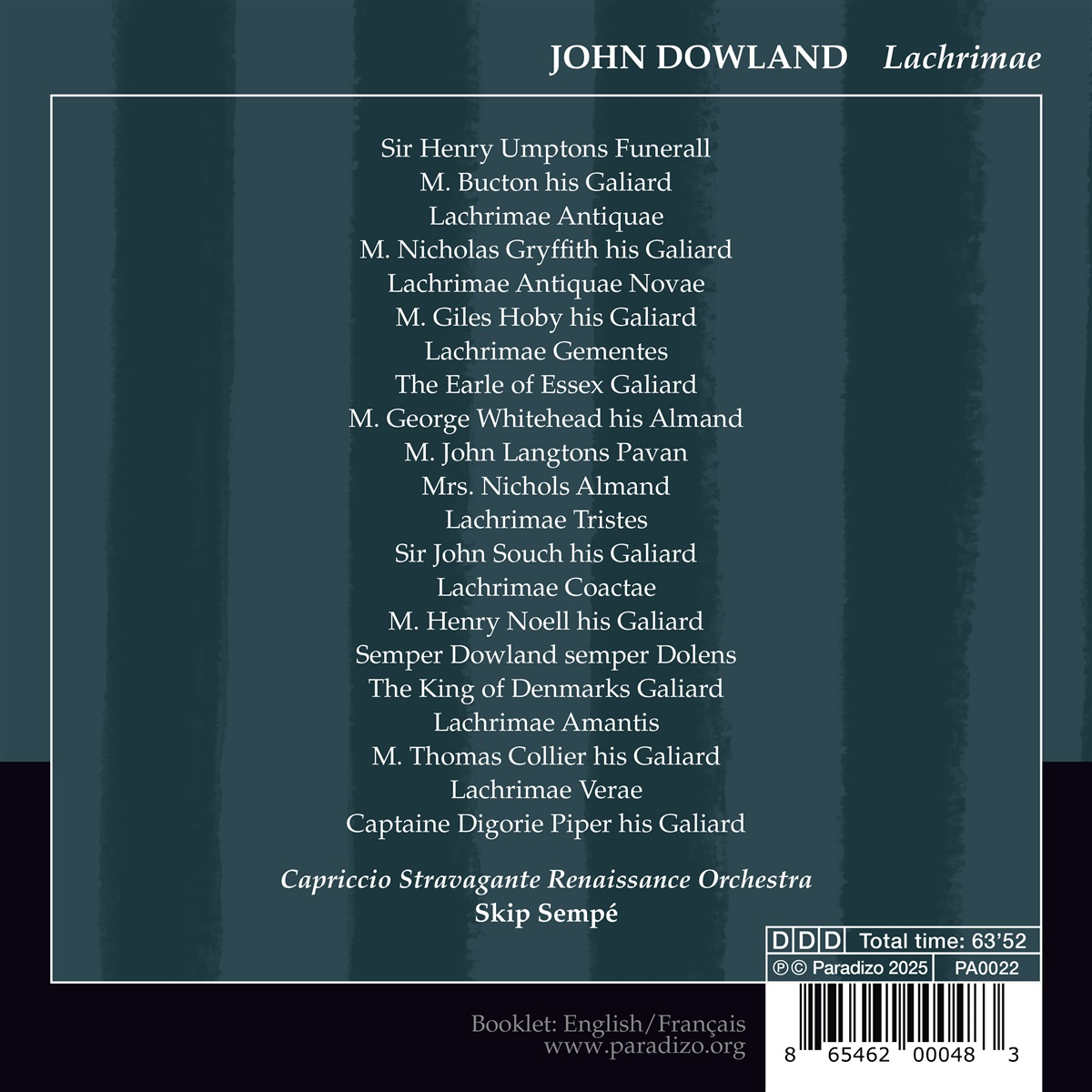 Diese Einspielung mit dem Renaissance-Orchester Capriccio Stravagante wurde von Skip Sempé für 6 Gamben, 5 Blockflöten, 2 Zinken, 3 Posaunen, 2 Virginale und Cembalo neu instrumentiert. Skip Sempés Anordnung der einundzwanzig Lachrimae-Tänze lässt die Tradition der Pavan- und Galliard-Paare wieder aufleben, anstatt sie als isolierte Sätze zu behandeln.
