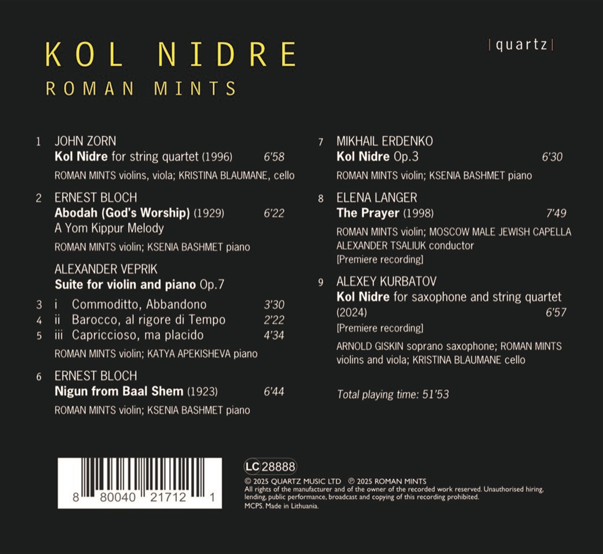 Dieses Projekt ist ein zutiefst persönliches Musikalbum, das auf jüdischen Themen basiert, die durch die Linse der persönlichen Geschichte, Erinnerung und Identitätssuche neu interpretiert werden. Im Mittelpunkt steht „Kol Nidre“ – ein altes Gebet, das seit langem Debatten auslöst und klassische Komponisten inspiriert. Das Album verwebt Tradition, Kindheitserinnerungen, vergessene Musik, die Stimmen unterdrückter Komponisten und musikalische Brücken zwischen den Kulturen. Es ist mehr als nur eine Sammlung von Stücken – es ist eine musikalische Reflexion über Erbe, Hoffnung und Zugehörigkeit. Das Album enthält zwei Weltpremierenaufnahmen: Elena Langers „The Prayer“ und Alexey Kurbatovs „Kol Nidre“. Roman Mints ist ein britischer Geiger. Er wurde in Moskau geboren und hat russische Premieren von Osvaldo Golijov, John Tavener, James MacMillan, Giacinto Scelsi und Marjan Mozetich sowie eine Vielzahl von Weltpremieren gegeben. Er gründete das jährliche Homecoming Chamber Music Festival, das in Moskau stattfindet. Auf dieser Aufnahme arbeitet er mit Kristina Blaumane, Katya Apekisheva, Ksenia Bashmet und der Moscow Male Jewish Capella unter der Leitung von Alexander Tsaliuk zusammen.