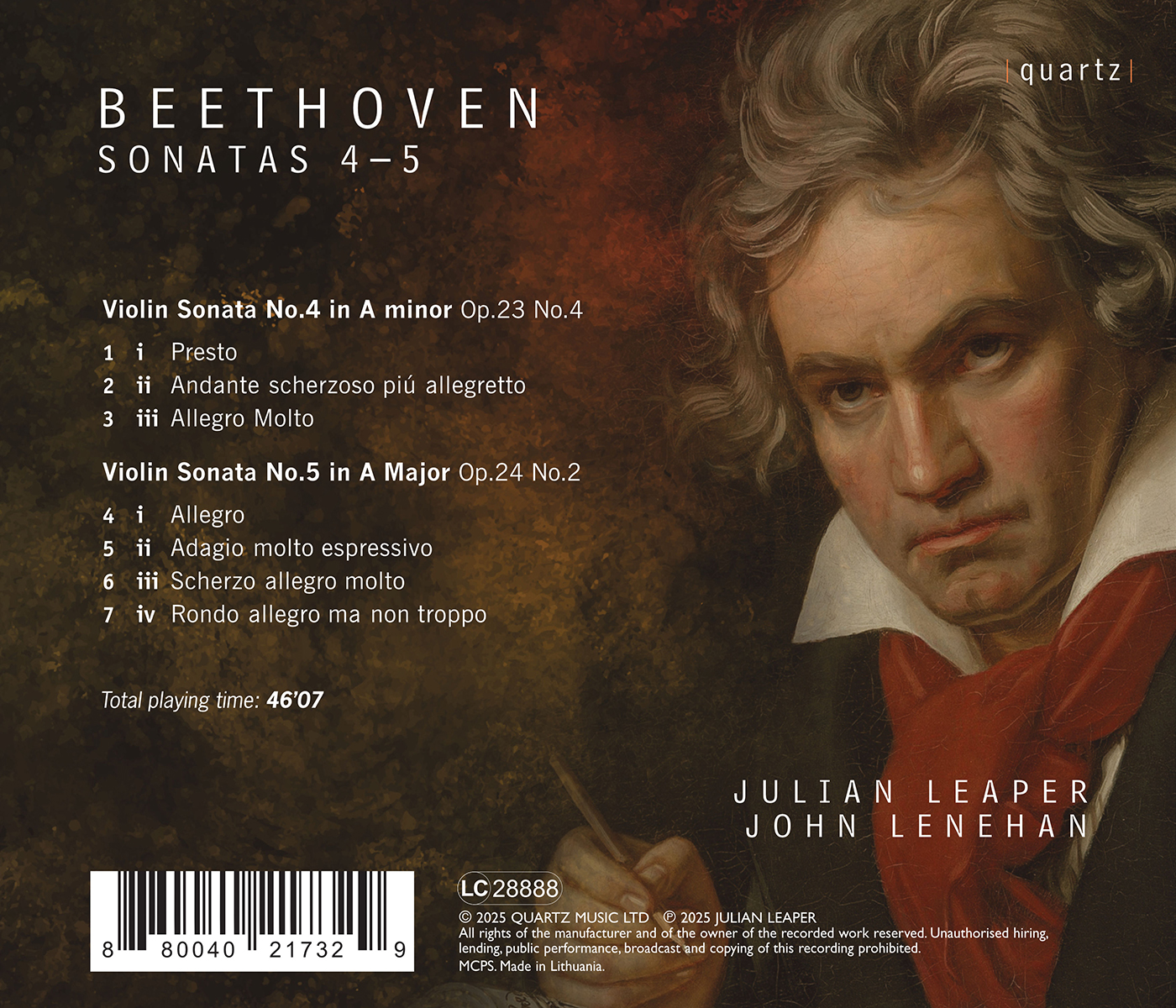 Die meisten der zehn Violinsonaten Ludwig van Beethovens entstanden innerhalb einer Zeitspanne von nur sechs Jahren (1797-1803), mit Ausnahme der letzten, op. 96, die er 1812 begann und dann wahrscheinlich weitere drei Jahre brauchte, um sie zu seiner Zufriedenheit zu überarbeiten. Dies bedeutet, dass die Reihe als Ganzes einen relativ jungen Beethoven repräsentiert, obwohl seine Entwicklung von den frühen Sonaten op. 12 bis zur „Kreutzersonate“ op. 47 deutlich eine gewaltige innere Schaffenskraft zeigt. Seine Cellosonaten, Streichquartette und Sinfonien sind gleichmäßiger über sein Leben verteilt, aber den Violinsonaten mangelt es nicht an Erfindungsgabe, Ausdrucksspektrum und Gefühl. Wie so oft in Beethovens frühen Werken sticht die Intensität der langsamen Sätze hervor. Dies ist Teil 2 der Julian Leaper-Aufnahmen der kompletten Violinsonaten und Leaper wird am Klavier von John Lenehan begleitet.