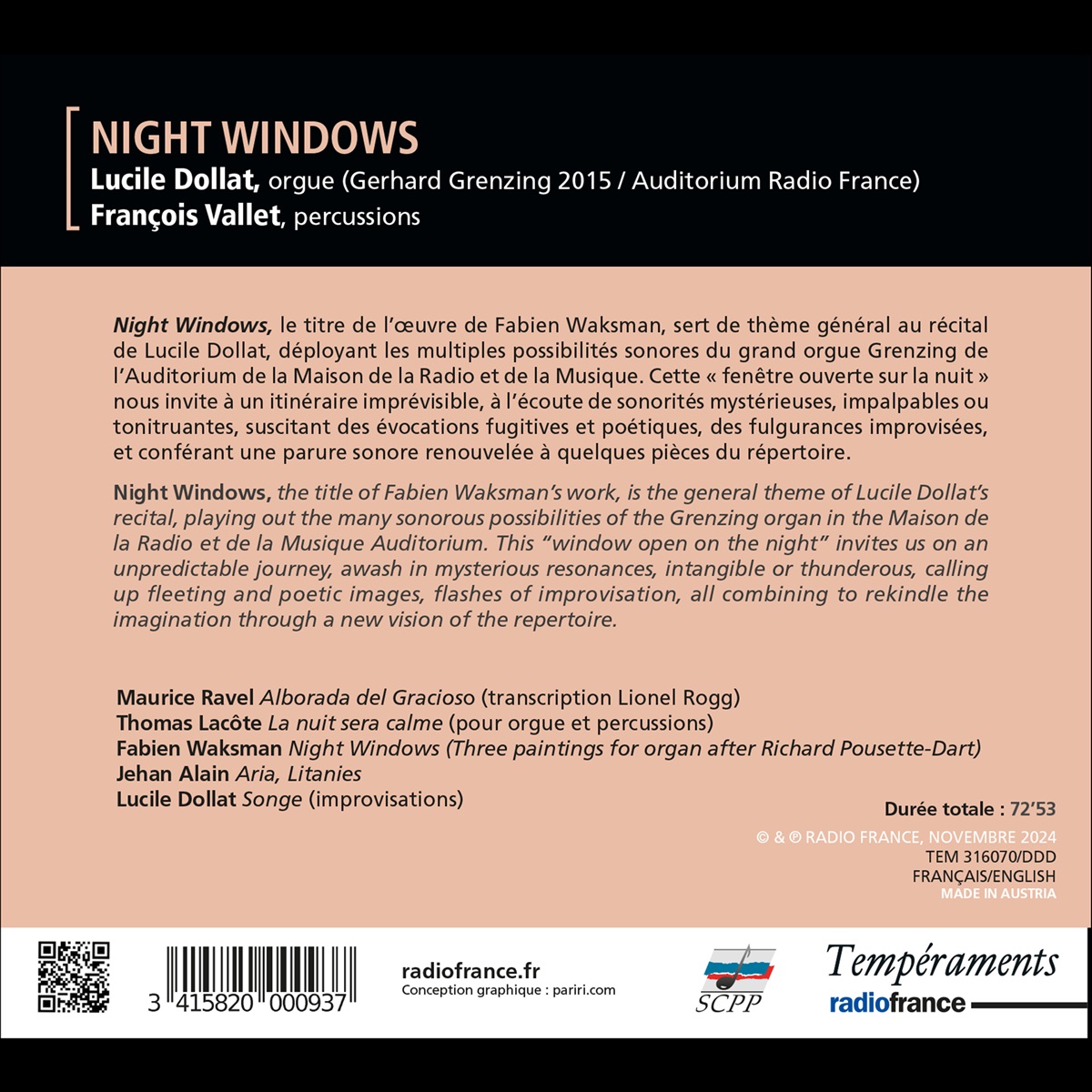 Fabien Waksmans Komposition "Night Windows" gibt diesem Orgel-Rezital von Lucile Dollat den Titel und führt in eine Welt mit geheimnisvollen, ungreifbaren oder donnernden Resonanzen, die flüchtige und poetische Bilder hervorrufen, in der Improvisationen aufblitzen und die Fantasie der Hörer durch neue Sichtweise des Orgel-Repertoires beflügelt. Lucile Dollat lotet die zahlreichen klanglichen Möglichkeiten der Grenzing-Orgel im Auditorium des Maison de la Radio et de la Musique aus. Dieses „Fenster zur Nacht“ öffnet eine neue Sichtweise des Orgel-Repertoires.