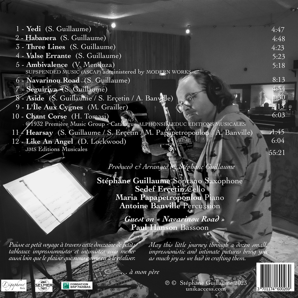 Stéphane Guillaume sagt über sein Album: Seit einigen Jahren suchte ich nach einer subtilen Möglichkeit, meine Erfahrungen als Jazzmusiker mit der Kammermusik zu verbinden. Mit der Istanbuler Cellistin Sedef Erçetin und ihrer Athener Kollegin, der Pianistin Maria Papapetropoulou, wollte ich den Platz der Violine in einem emblematischen Trio einnehmen. Unterstützt von einem unschätzbaren Reisebegleiter – Antoine Banville, hier am Schlagzeug – findet die Gruppe ein Gleichgewicht von Farben und Rhythmen, in das ich die Wendungen meiner Komposition einwebe, und ich hoffe, meine impressionistischen und intimen Bilder bringen meinem Publikum so viel Freude, wie wir bei ihrer Entstehung hatten.