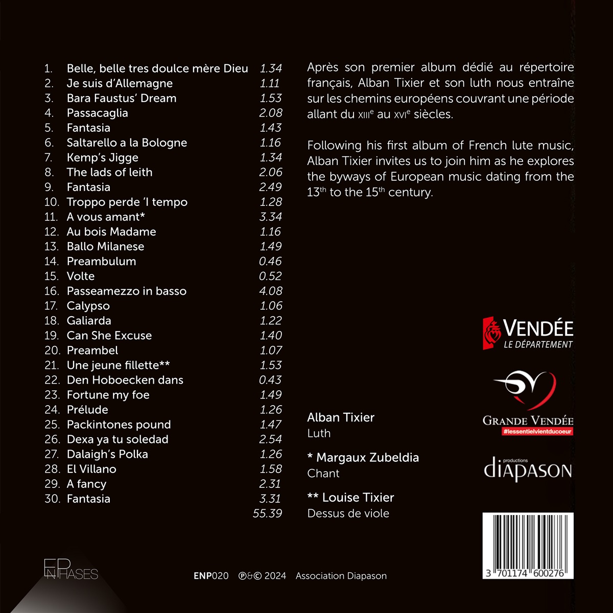 Nach „Suzanne un jour“ mit einem Repertoire französischer Musik lädt uns Alban Tixier auf seinem zweiten Album zu einer Europareise mit seinem Instrument, der Laute, ein. In derselben Dynamik wie beim ersten Albm findet man auch hier die ganze Feinheit der Interpretation, eine gewisse Effizienz und eine gezielte Auswahl von Werken, die es einem breiteren Publikum ermöglichen, ein Instrument zu entdecken, aber vor allem zu verstehen, das heutzutage nur noch wenige Menschen kennen. Denn der Zugang zum Hören eines alten Instruments, erst recht wenn es solistisch gespielt wird, erfordert eine gewisse Anstrengung. Alban Tixier glaubt an eine Zukunft für akustische Instrumente, und das nicht aus Nostalgie, sondern vielmehr aus dem Wunsch heraus, die Musikwelt einer Epoche wiederzuentdecken, die man „Renaissance” nennt, mit allem, was dieser Begriff beinhaltet. Da die Renaissance zyklisch ist, kann man hoffen, dass die Zukunft strahlend sein wird.
