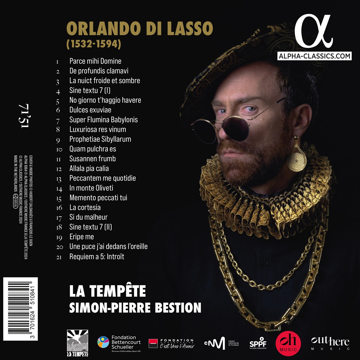Orlando di Lasso (geb. 1532 in Mons) war einer der bedeutendsten und produktivsten Komponisten des gesamten sechzehnten Jahrhunderts. Als Sänger von Kindesbeinen an berühmt, entkam er mehreren Entführungsversuchen von Fürsten, die sein Talent für ihre Höfe begehrten. Di Lasso ist eine faszinierende Persönlichkeit: eine extravagante und provokante musikalische Figur, ein abenteuerlicher Künstler und kultivierter Polyglott. Als Simon-Pierre Bestion von Joachim Thôme gebeten wurde, den Soundtrack für einen Dokumentarfilm über di Lasso zu liefern, tauchte er in das Multiversum des Komponisten ein. Dieses Album, eine Erweiterung der Musik für diesen Film, projiziert den Ikonoklasten di Lasso in die Welt des 21. Jahrhunderts. Bestion erklärt: ‚Ich habe mich hier bewusst dafür entschieden, diese Musik mit einer großen Freiheit bei der Instrumentierung und den Klangfarben zu interpretieren. Und obwohl es zu di Lassos Zeiten weder Schlagzeug noch Saxophon gab, stand es dem Interpreten frei, Ornamente seiner Wahl zu benutzen‘. Das gemischte Ensemble La Tempête unter der Leitung von Gründer Simon-Pierre Bestion unternimmt diese stets unvorhersehbare, phantasievolle Erkundung des zeitlosen Reichs von Orlando.